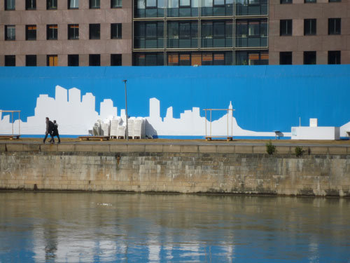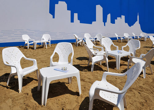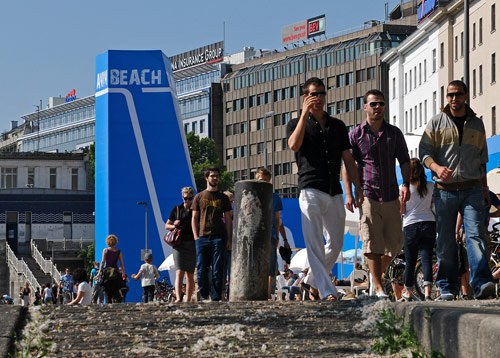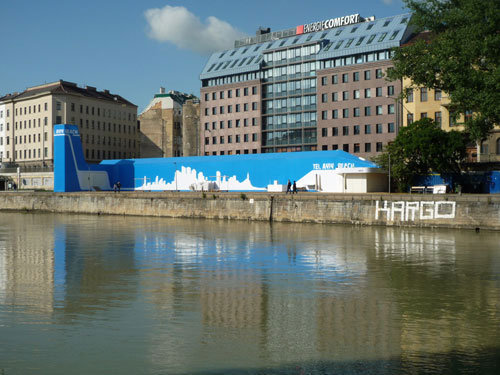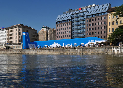 Zwischenzeitlich (von Mai bis September 2009) gesellt sich zu „Flex“ und „Summer Stage“, „Badeschiff Wien“, „Strandbar Herrmann“ und „Glashaus Adria“ südlich des ehemaligen Schützenhauses von Otto Wagner und direkt neben dem U-Bahnausgang Schottenring (U2/U4) die temporäre Installation „Tel Aviv Beach“. Anlass für den Gastauftritt am leopoldstadtseitigen Ufer des Donaukanals sind die 100-Jahr-Feiern der Stadt Tel Aviv, deren abstrahierte Hochhaussilhouette auch die blau-weiße Backlite-Folie ziert, mit der die gerüstartige Holz-Stahl-Konstruktion (bestehend aus Turm, Skylinelement und Beachbar) überzogen wurde. „Echte Tel Aviv Beach Chairs, feinster Meersand und spezielle Lichteffekte sorgen für ein relaxtes Verweilen am Strand“, erläutern SHARE Architekten ihr relaxtes Konzept. Das Catering für den bis zu 300 Gäste fassenden Strandbereich übernahm Szeneköchin Haya Molcho, die vor einigen Monaten am Naschmarkt ein zweigeschossiges (und viel gelobtes) Lokal eröffnet hat. Und im Unterschied etwa zum Strandbad Herrmann lässt sich auf dieser Seite des Donaukanals auch die Abendsonne länger genießen – sofern sie scheint.