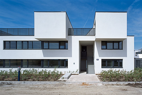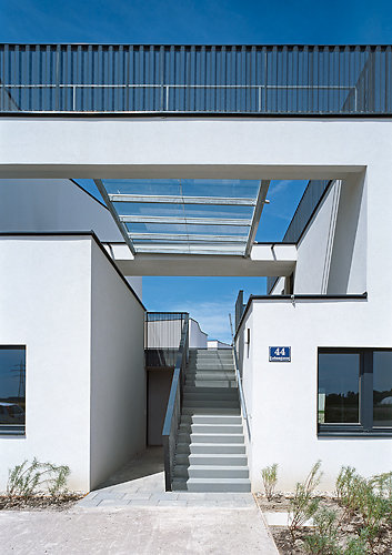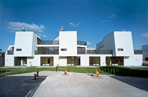 Aus der Ferne herrscht ein einheitliches Bild, die weißen Putzflächen leuchten in der Sonne, Assoziationen zu mediterranen Siedlungen drängen sich auf. Erst wenn man die Anlage durchwandert, wird deutlich, dass kein Haus dem anderen gleicht. Ähnlich, aber nicht identisch bilden die Häuser ein mal dichteres, mal poröseres Muster. Durch Rücksprünge in der Fassade konnte die Fassadenfläche minimiert werden, nach der sich im Rahmen der Bauklasse die maximale Gebäudehöhe bemisst. Die an der Fassade verlorene Kubatur wurde in der Höhe wieder zurückgeholt – ein Spiel mit der Wiener Bauordnung, die die Architekten auch mit Erkern und fiktiven Giebeln trickreich auszuloten wussten.