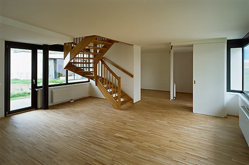 Aus ökonomischen Gründen lag es nahe, mit Präfabrikation, in diesem Fall mit Stahlbetonfertigelementen zu arbeiten. Das Statikbüro Woschitz Engeneering entwickelte eine kraftschlüssige Verbindung dieser Elemente, sodass auch Auskragungen und andere „Sonderfälle“ bewältigt werden konnten. Als Fassadendämmung (18 cm) kam graues EPS-F Plus zum Einsatz, vom konventionellen Verputz musste nur an den Schrägflächen abgewichen werden, die mit einer Spritzfolie beschichtet sind. Die Terrassen- und Balkone sind mit edel wirkenden (aber kostengünstigen) Brüstungen aus anthrazitfabenen Well-Lochblechen ausgestattet. Auch im Inneren gelang es den Architekten, mit Stabparketten, gewendelter Holzstiege und Schiebetüren einen Ausbaustandard zu realisieren, der im gefördeten Wohnungsbau keine Selbstverständlichkeit ist.