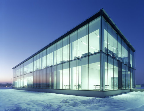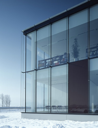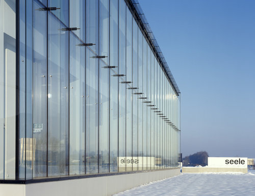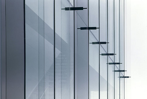 Die Fassade besteht aus seriellen Glasrahmenkonstruktionen mit einer Größe von 2 auf 10 m. Die Glastafeln sind in Geschoßhöhe gestoßen, die Tragkonstruktion aus Glasschwertern ist außen liegend geklebt.