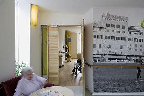 Die Architekten setzen mit jedem noch so kleinen, gestaltenden Element atmosphärische Gesten von Ruhe und Würde. Mit dezenten, alten Rollmustern an den Wänden, wie man sie heute kaum noch findet. Mit der Auflösung von geometrischer Strenge durch Knicke in den Trennwänden und Decken der privaten Räume. Mit Wandablagen und Regalen für persönliche Erinnerungsstücke. Mit der Aufweitung des Mittelgangs durch einen zentral gelegenen, verglasten Zubau für den Schwesternstützpunkt, der wie ein Rucksack über dem Zugang hängt. Mit hellen, freundlichen Möbeln, mit Trennwänden aus Milchglas, die das bunte Dahinter der Serviceräume durchschimmern lassen. Mit einem verschwenderisch großen, von Licht durchflutetem Badezimmer, in dem man sich wie ein König in der Wanne fühlen kann. Mit der sorgfältig zusammengestellten Auswahl an Leuchten, die eigens angefertigt wurden. Und mit raumhohen Bildtapeten der Fotografin Zita Oberwalder – Motive von Landschaften und Orten, die Erinnerungen an ein erfülltes Leben sein können oder Inspiration für Träume von künftigen Orten, für die wir keine Bilder haben.