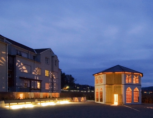 HoG Architektur überzeugte mit einem stimmigen Konzept: Betonplatten mit besenrauer Oberfläche, deren polygonale Kontur sich aus den Potenzialen des jeweiligen Standorts entwickeln, schaffen charakteristische Grundebenen, auf denen sich die an allen Orten wiederkehrenden Funktions- und Gestaltungselemente präsentieren: der Klingensteiner Achteckstadel im Original oder zu einem Pavillon transformiert, das symbolisierte Hügelland mit Apfelbaum, die Milchstraße, Laube, Sitzbänke und Fahrradständer.