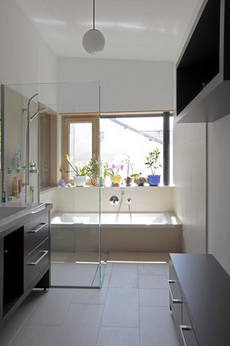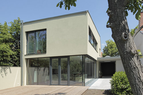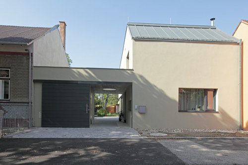Zur Alleebaum bestandenen Gasse zeigt sich das Haus zurückhaltend wie elegant, fügt sich aber im Kontext der hier vorherrschenden historisch, ortsbaulichen Prägung. Geschlossene Bebauung, strukturelle Einordnung, Traufhöhe und Steildachverpflichtung, etc. sind Vorgaben aus dem Bebauungsplan. Eine bislang fehlende Zugänglichkeit zum südseitigen Garten und Grünbereich wird durch die neue, um 90° ausgedrehte Stellung des kompakten Baukörpers in die Tiefe erzielt. Das zur Sonne orientierte, zweigeschossige Objekt mit hohem Befensterungsanteil, bildet mit dem neuen Nebengebäude und den flankierenden Nachbarobjekten eine nicht einsehbare, baumbestandene und durchgrünte, großzügige Innenhofzone. Diese intime Innenhof-Freiraumzone hat gelungene historische Vorbilder im niederösterreichischen Weinviertel, welche in Nutzbarkeit und Außenraumqualität Vorbildcharakter haben und zum saisonal-mediterranen „hinauswohnen“ hohe Akzeptanz findet. Das Erdgeschoss funktioniert völlig eigenständig und ist in seiner Nutzbarkeit barrierefrei ausgelegt; ein Aspekt zur Nachhaltigkeit. Das Kompaktgerät, gespeist aus einer Tiefensonde, sorgt als Wohnraumlüftungsanlage mit Wärmerückgewinnung für permanent frische Luft, warmes Wasser, sowie bedarfsgerecht für wärmende oder kühlende Raumluft im Gebäudeinneren.