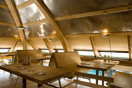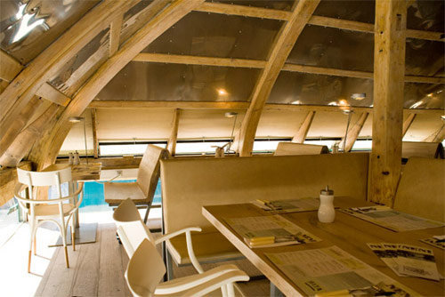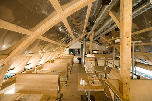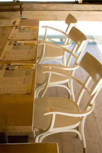 „Die Gäste sollten das Gefühl haben, dass das Lokal schon immer dagewesen sein könnte, und dass es dementsprechend kaum vom Standort wegzudenken ist“, beschreibt Eva Beresin ihren Gestaltungsansatz. Die Outdoor-Möbel sind zum Teil generische französische Bistromöbel (Fermob Bistro Original 1889), die Bestuhlung im Extrazimmer stammt aus Frankreich der 1930er-Jahre. Die hohe Schule der Einfachheit ist auch in den Gasträumen Programm: Robuste Tische und Sitzbänke aus gebürsteter Eiche werden mit weißlackierten Thonet-Stühlen von Hermann Czech kombiniert, blanke Stahlblechpaneele, die den Dachraum auf sympathisch imperfekte Weise veredeln, setzen zur gereinigten Holzkonstruktion des Dachstuhls einen ungekünstelten Kontrast. Die Klimaanlage im Obergeschoss war gewiss eine lohnende Investition, doch sorgen auch die Kippflügelfenster entlang der Trauflinie nicht nur für interessanten Ausblick, sondern auch für die nötige Frischluft.
