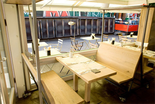 Auch das flexible Shopsystem des NENI (fünf rollbare Kästen aus Eichenholz und Metallnetz, die variable Arrangements ermöglichen) bezeugt den verfeinerten Pragmatismus, der dem Lokal seinen besonderen Charme verleiht. (Text: Gabriele Kaiser)