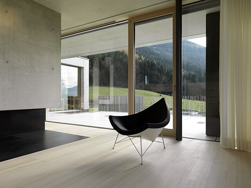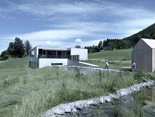 Einem gelandeten Meteoriten gleich sitzt der mit Scharten und Rücksprüngen geformte Körper im Hang. Die angrenzende Streuwiese nimmt den Naturbadeteich in die Umklammerung und holt die bewirtschaftete Grünzone dicht ans Wohnhaus. Ein auf den Fundamenten eines kleinen Stadels errichtetes einfaches Badehaus in Holz ist ein weiteres, atmosphärisch und funktionell wertvolles Bindeglied zu den umliegenden Agrarflächen.