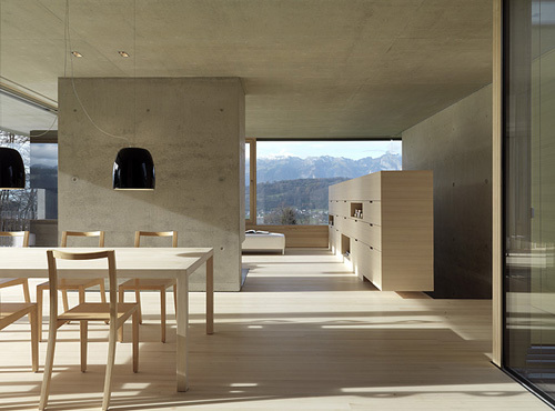 Von der Garage bis zum Elternschlafbereich, vom Kochstudio bis zum Wohn-, Essbereich sind dort die Hauptfunktionen in fließenden Raumübergängen angeordnet. Blickbeziehungen über die Diagonalen und Achsen verblüffen und suggerieren Größe und Weite. Im Untergeschoss werden die Räume kompakt und determinierter. Arbeits- und Kinderzimmer, Service- und Badezimmer, Sauna und Musikraum komplettieren das Raumangebot.