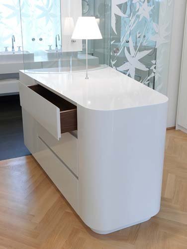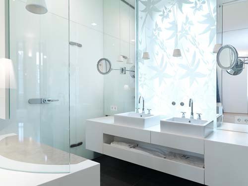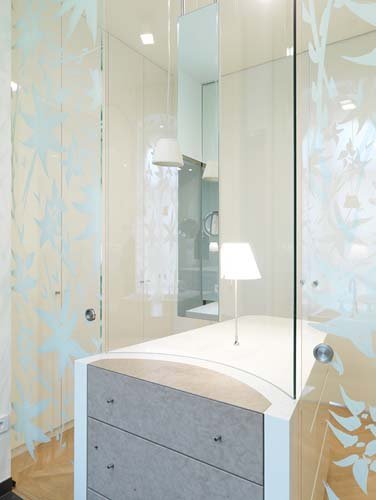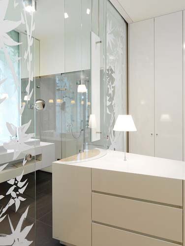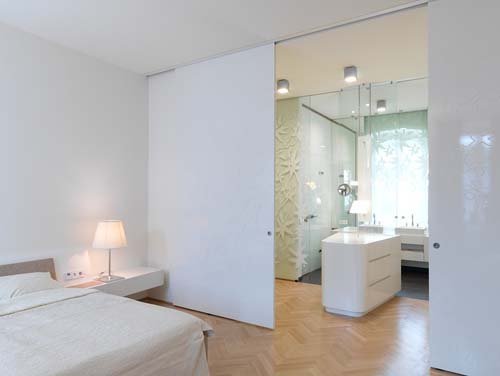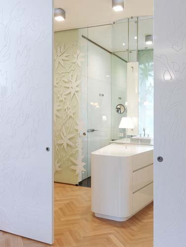 Drei parallele Schiebetüren in unterschiedlichen Materialien (Milchglas, transparentes Glas und Holz) erlauben eine Öffnung des Raumes in drei Schritten. Die erste Ebene ist eine öffenbare Milchglaswand an der Innenseite des Fensters zum Garten. Sie schützt vor Einblicken und lässt Licht durch. Ebene Nr. Zwei ist die transparente Glaswand, welche Bad und Schrankraum trennt. Die dritte Ebene (gefräste Holz-Schiebetür) ermöglicht es, Schlafraum und Bad temporär zu einem großen Ambiente verschmelzen zu lassen. Wird diese Wand geschlossen, erzeugt sie die im Schlafbereich gewünschte Verdunkelung und visuelle Ruhe. Die Oberflächen-Ornamentik der Schiebeelemente wurde gemeinsam mit dem Künstler Roman Scheidl entwickelt. (Text: Architekten)