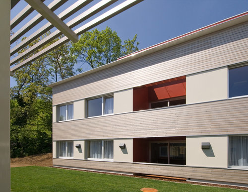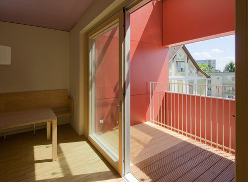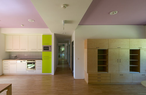 Direkt an der Kommunikationsebene, oben am Hang gelegen befinden sich die 4 Wohngruppen. Im Zentrum der Wohnungen ist der Koch- und Essbereich. Vertraute Geräusche, Gerüche, Tätigkeiten herrschen hier vor. Die Gemeinschaft miteinander steht im Vordergrund. Der Grundriss bildet Winkel, Nischen, um sich emotional anlehnen zu können. Der durchgesteckte Mittelbereich ist von beiden Seiten belichtet, die Terrasse nach Osten ermöglicht es, geschützt im Freien zu sein. Die Zimmer orientieren sich auf die sonnige Seite, jedes Kind hat eine eigene Schlafnische. Pro Geschoß ist eine Station mit einer behindertengerechten Sanitäreinheit ausgestattet. Ein behindertengerechter Lift ermöglicht den vertikalen Transport.