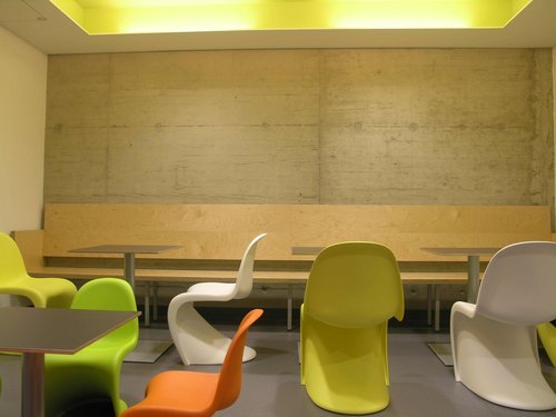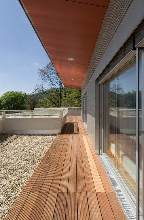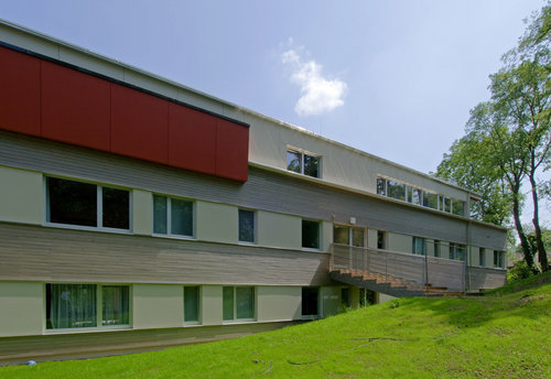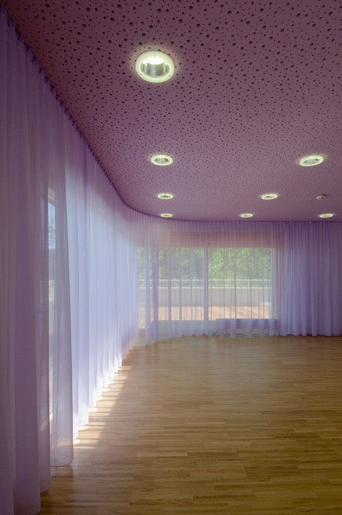 Eine Besonderheit des Grundstückes ist die Aussicht vom Hang nach Südwesten. Daher befinden sich die Therapiebereiche am Dach, auf kurzen Weg von den Gruppen zu erreichen. Hier ist auch der mit Vorhängen gestaltbare Gruppentherapieraum. Der weite Ausblick über das Grazer Feld, die Dachterrasse verstehen sich als unterstützende räumliche Weite für die Therapie.