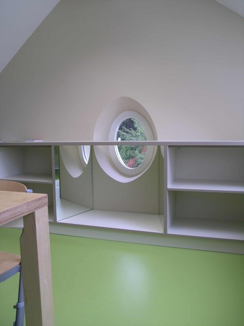 Das begründet, zusammen mit dem „Schulweg“ eine eigene Identität im gesamten Pavillonsystem. Nach Westen hin befindet sich direkt vom Eingangsfoyer erreichbar der Bewegungs- und Werkraum. Nach Osten sind im Zubau große Fensterflächen angeordnet, der westliche Bauteil ist in den Hang eingeschüttet. Vor der Schule ist der Schulhof angelegt.
