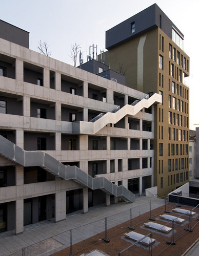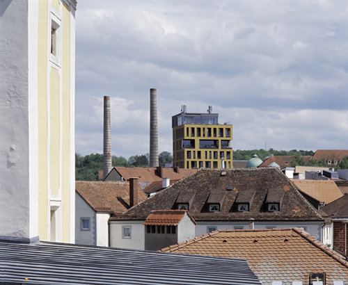 Das Haus verwendet teilweise die Konstruktion des ursprünglichen Siebzigerjahre-Baus, eine Skelettbauweise. Die Gliederung in zwei städtebaulich unterschiedlich wirksame Elemente wird jedoch stärker herausgearbeitet. Ein liegender Bauteil, der die Strasse begleitet, ist um ein Geschoss niedriger als bisher gestaltet. Dies nimmt die Maßstäblichkeit der Pachergasse auf. Seine Stirnseite, eine ehemalige Feuermauer, ist nun mit Fenstern geöffnet, wodurch er als ganzer Körper und nicht mehr lediglich als Fassade erkennbar ist. Der stehende Bauteil ist um drei Geschosse aufgestockt, um dem Turm mehr Prägnanz zu verleihen. Sein klares Herausragen aus den Baumassen des Umfeldes verweist auf die Bedeutung des bisher einzigen funktionierenden Wirtschaftsturms – als Ergänzung zu den vorhandenen sakralen Türmen - der Stadt. Seine Aura kann sich auf das Stadtviertel ausbreiten.