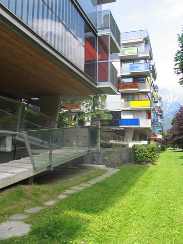 Die aus einem Wettbewerb hervorgegangene Wohnbebauung setzte als „Oase in der Stadtwüste“ neue Maßstäbe im sozialen Wohnbau – wie Edith Schlocker (Tiroler Tageszeitung, 6. 8. 2003) treffend das Entwurfsmotiv beschrieb: „Die in der Reichenau an den Ufer des Inn gebauten „Strandsatelliten“ sind eine poetische Metapher für sozialen Wohnbau vom Feinsten. Markenzeichen der sechsgeschossigen Häuser ist ihre bunte Glashaut. Sie entmaterialisiert gleichsam die Baukörper, ihr Rot, Blau und Gelb suggeriert aber auch positives Lebensgefühl. Und ein solches ist hier auch angebracht: Denn obwohl im städtischen Ballungsgebiet situiert, ist die Wohnanlage eine absolute Oase der Ruhe.“ (Text: Claudia Wedekind)