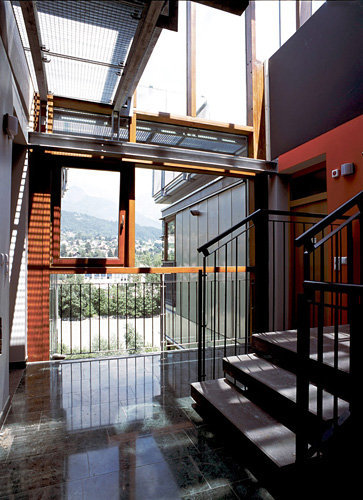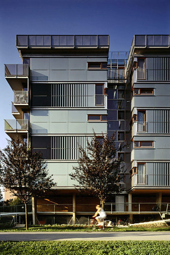 Insgesamt 120 Wohnungen sind in den drei sechsgeschossigen Baukörpern untergebracht, deren Erscheinungsbild von hinterlüfteten Glasfassaden und der bunten Glashaut der Balkone geprägt wird. Jede einzelne Wohnung verfügt über entsprechende Besonnung und Aussicht, auf den Dächern der Häuser finden die Bewohner zusätzlich gemeinsam nutzbare Dachterrassen.