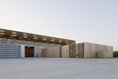 Der nördlich an die Halle anschliessende, eingeschossige Lager- und Sozialtrakt, in dem sich diverse Lagerbereiche, sowie Wasch-, Umkleide-, und Sozialräume befinden, wurde in Massivbauweise errichtet und mit einer hinterlüfteten Holzfassade verkleidet.