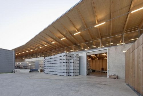 Der Weg zwischen Lagerhalle und altem Betriebsgebäude wurde über einen überdachten Arbeitsbereich geführt, der nordseitig zum Hof eine Laderampe ausbildet. Westlich von diesem Arbeitsbereich befindet sich in der sonst ungedämmten, in Holzkonstruktion ausgeführten Halle (ca. 86 x 30 m) ein Baukörper aus Beton, der als gedämmtes Flaschenlager dient.