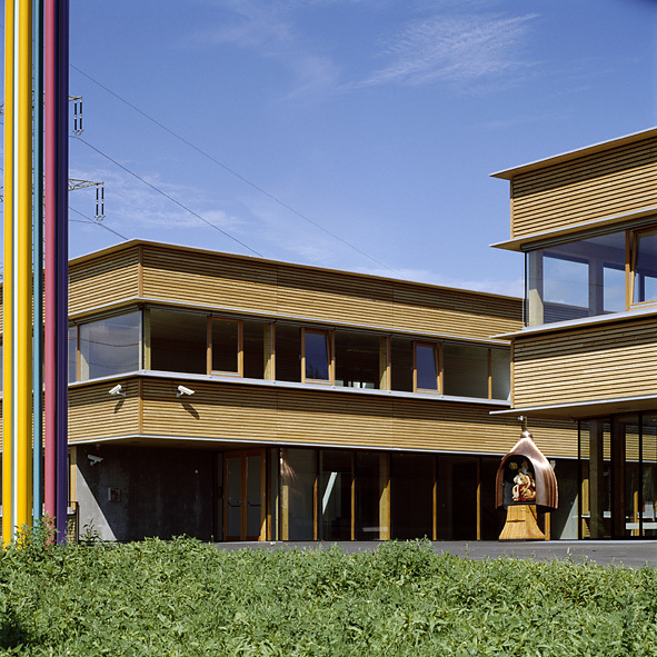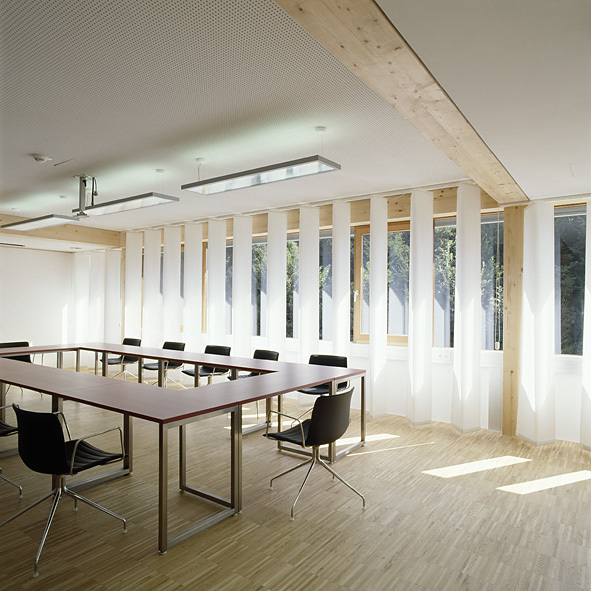 Durch die Kompaktheit der Baukörper, entsprechende Dämmstärken und ein günstiges Verhältnis von Glas- zu Holzoberflächen konnte trotz eines geringen Aufwands an technischer Infrastruktur Niedrigenergiestandard erreicht werden.
