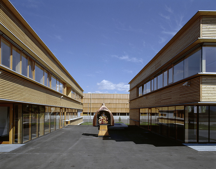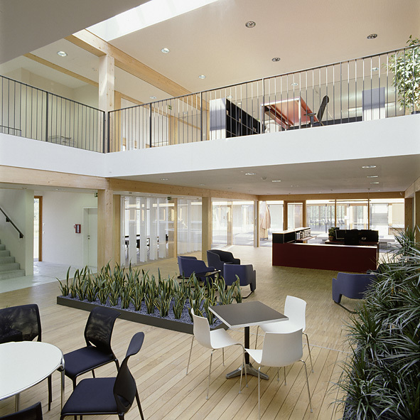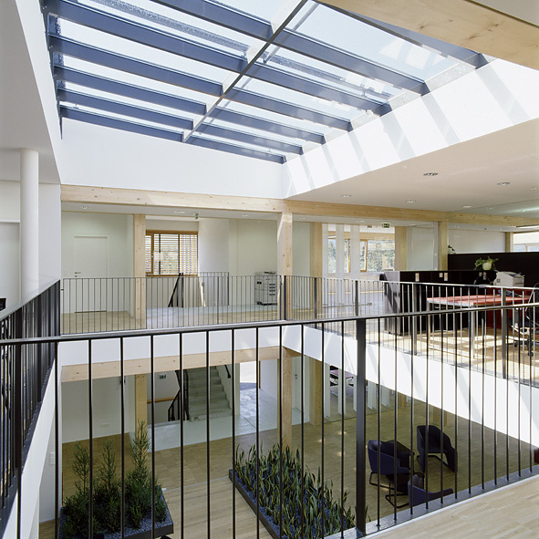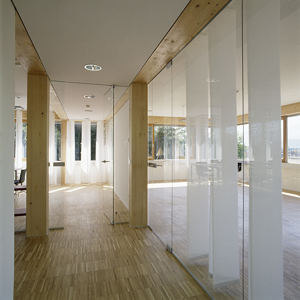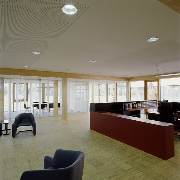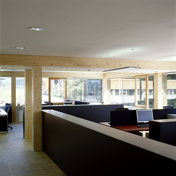 Grundrisstypologisch unterscheiden sie sich auf Grund verschiedener Anforderungen wesentlich voneinander: Im östlich gelegenen, nahezu quadratischen Gebäude des Holzbaubetriebs sind die Büros um ein Atrium gruppiert, wodurch auch in den innenliegenden Räumen und Erschließungszonen optimale Tageslichtverhältnisse und somit ideale Erholungs- und Sozialräume im Zentrum des Gebäudes vorhanden sind. Eine flexible Bürostruktur, Kontakt über beide Ebenen hinweg und helle, freundliche Atmosphäre waren wichtige Parameter, die mit Hilfe dieser Organisationsstruktur umgesetzt wurden.