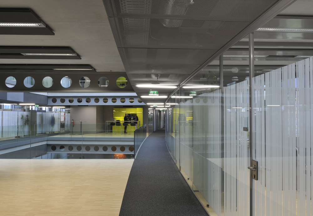 Die feingliedrige Fassade erlaubt einen sensiblen und an die verschiedenen Tätigkeiten angepassten Umgang mit natürlichem Licht. Zusätzlich verstellbare Sonnenschutzstores an der Büroinnenseite gewährleisten blendfreie Bildschirmarbeitsplätze.