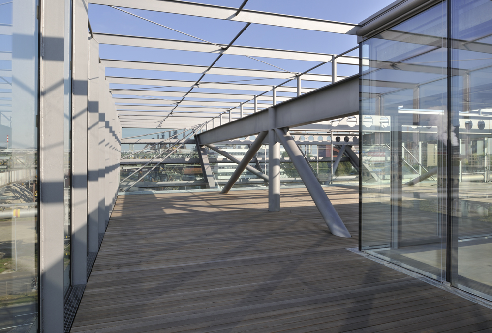 Die Lage im Dachbereich ermöglicht einen Überblick über das gesamte Gelände. Eine zusätzliche Freiterrasse im Anschluss an die Besprechungsräume erweitert den Konferenzbereich in der Form eines Bélvédères.