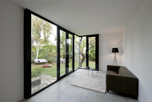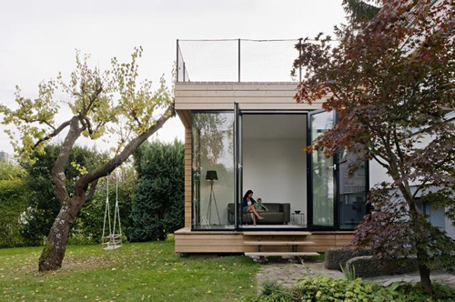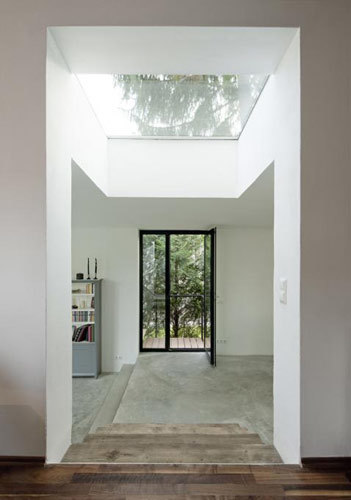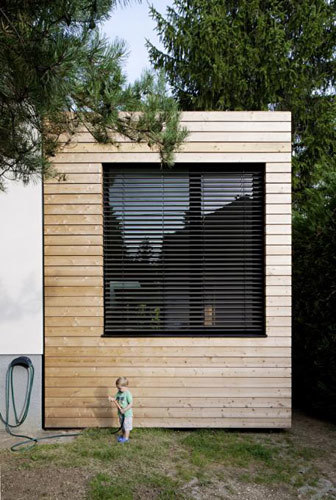 Dank der punktuellen Gründungen war es möglich, den schönen Baumbestand vollständig zu erhalten. Der längliche Baukörper folgt dem abfallenden Gelände in den Garten. Das Dach ist Richtung Straße aufgeklappt, sodass die Nachmittagssonne in den Wintermonaten tief in den Zubau eindringen kann, zugleich bleibt die Dachterrasse vor Passantenblicken geschützt. In der Materialität korrespondiert der Zubau mit dem Bestand: »Das Holz für die Innenstiege war vor Ort vorhanden und wurde weiterverwendet, der flügelgeglättete monolithische Betonfußboden führt passend zum Bestandshaus die einfache, unspektakuläre Architektursprache fort«, berichten SUE Architekten. Die liegende Holzschalung betont die »liegende« Anmutung des kleinen Annexes, die Verbindung zum Garten könnte kaum inniger sein. (Text: Gabriele Kaiser)