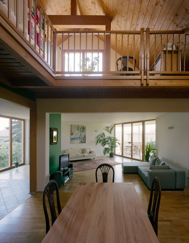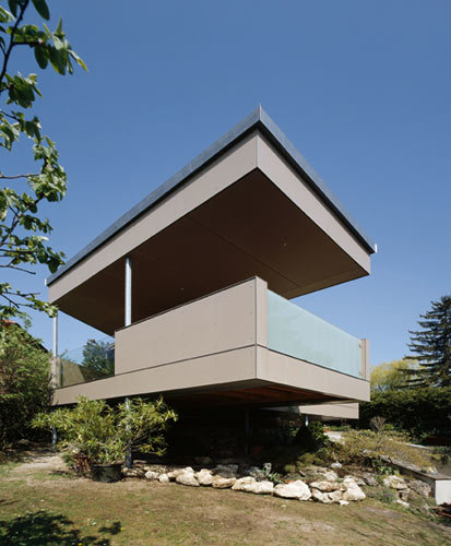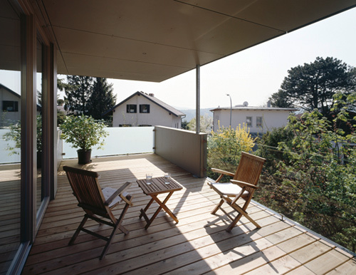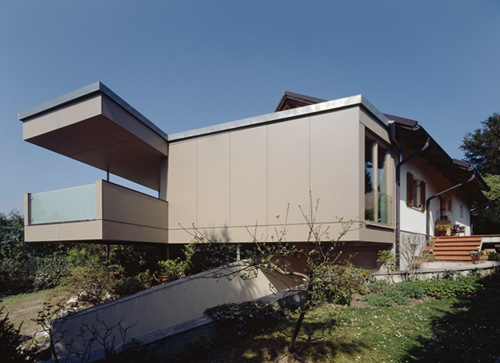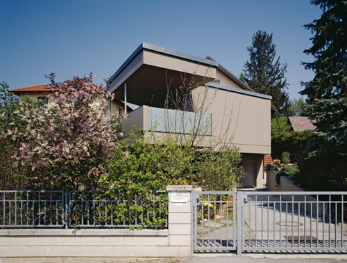 Die Größe und Lage des 38,50 m² großen Zubaus resultiert aus der maximal zu bebaubaren Restfläche des Grundstücks und dessen vorderen und seitlichen Baufluchtlinien. Gemäß dem Wunsch der Bauherren, sollte der neue Baukörper uneinsehbar gegen die Wohnstraße gestaltet werden und die eng parzellierte nachbarschaftliche Umgebung abschirmen. Die Lösung fand man in der konsequenten Schließung der Hauptfassade. Die natürliche Belichtung des Zubaus erfolgt ausschließlich über raumhohe Fenstertüren an der Süd-Ost- und Nord-Westseite.