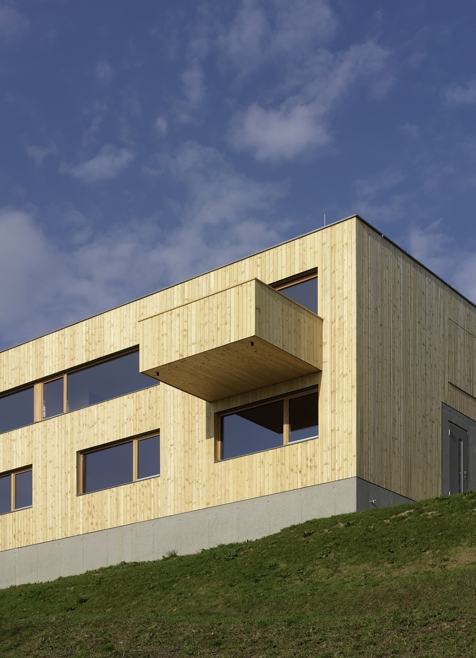 Das hoch gedämmte Haus wurde als Niedrigenergiehaus konzipiert und verfügt über eine Solaranlage zur Warmwasserbereitung, sowie einen Erdwärmetauscher zur Beheizung. Um die Dachfläche, die als fünfte Fassade von oberhalb deutlich sichtbar ist, ins umgebende Gelände zu integrieren, wurde das Dach extensiv begrünt. (Text: Tobias Hagleitner nach einem Text der Architekten)