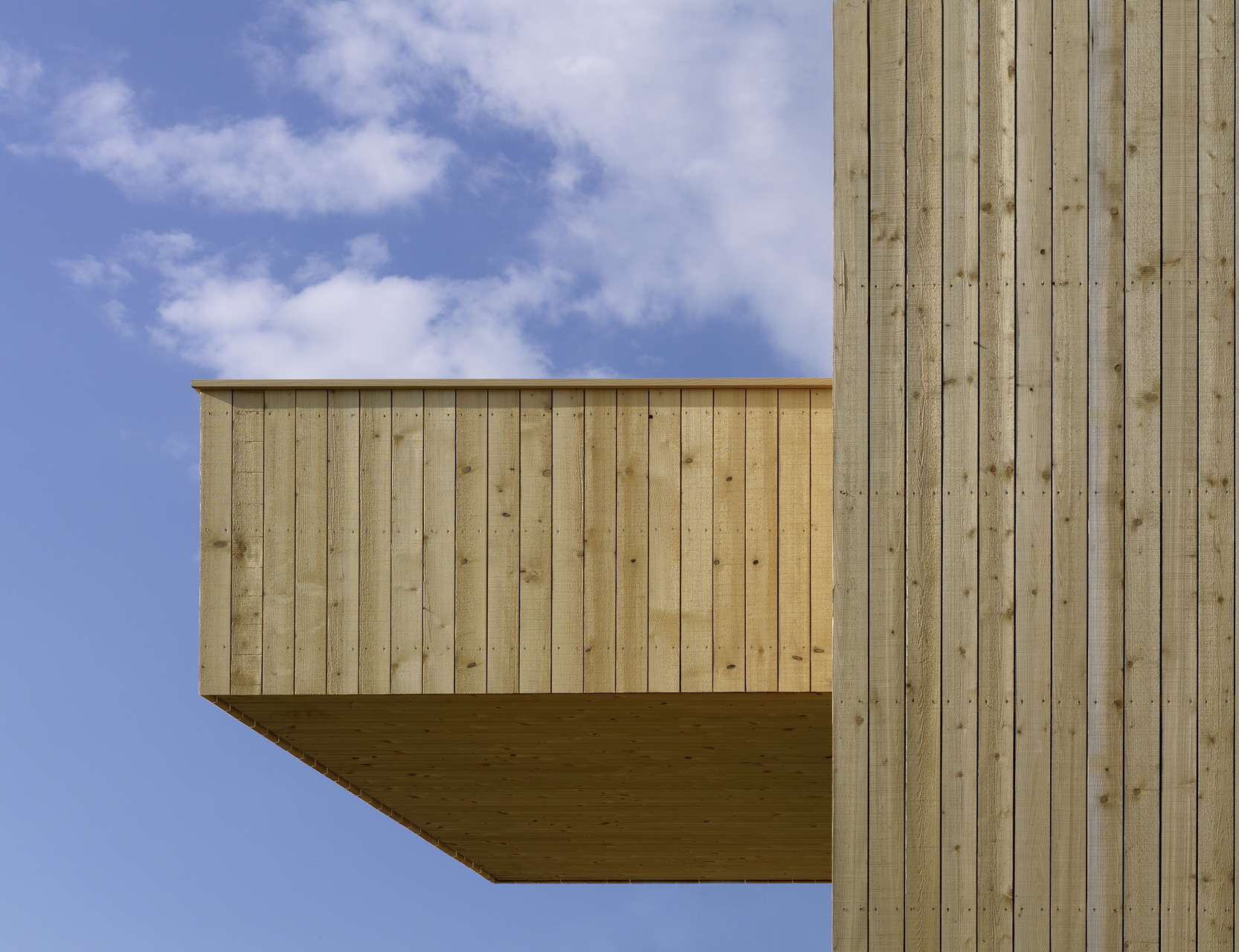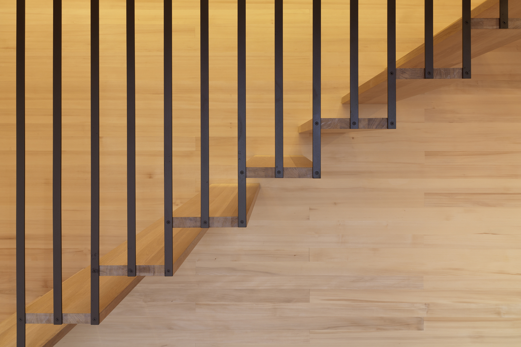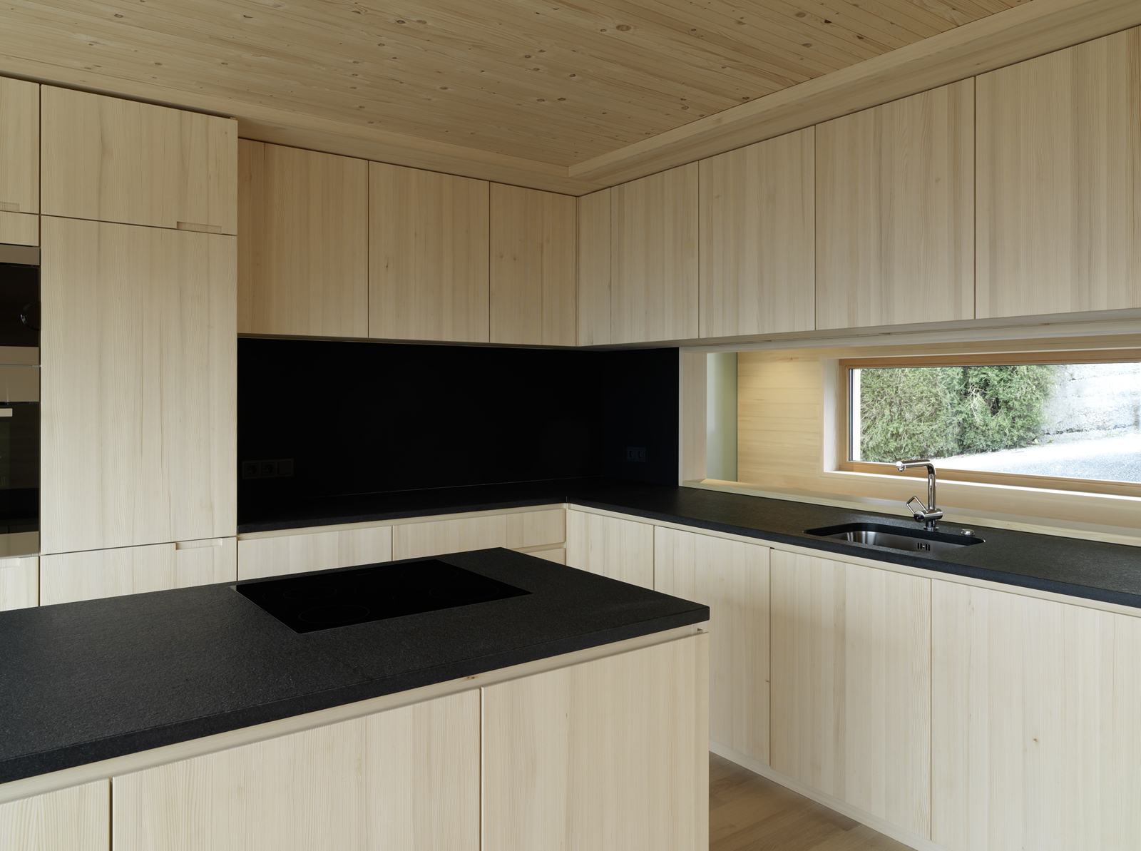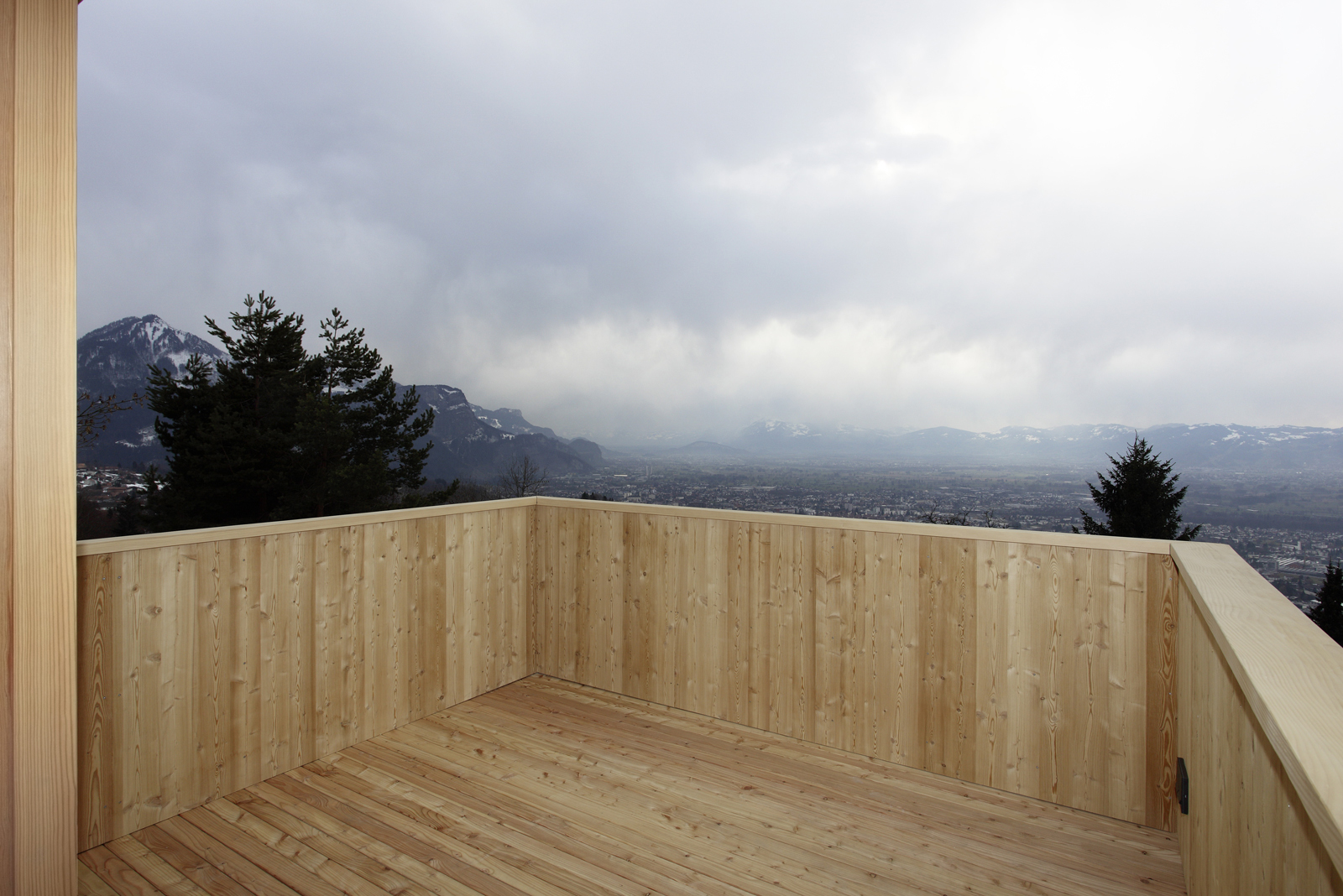 Innen verleihen die großteils unbehandelten Holzoberflächen warme Atmosphäre. Große, schwenkbare Läden an der Süd- und Nordfassade lenken in geöffnetem Zustand den Blick in Richtung Schweizer Berge und Bodensee und bieten zugleich Intimität für den Innenraum durch seitlichen Sichtschutz zu Straße und Nachbarschaft.