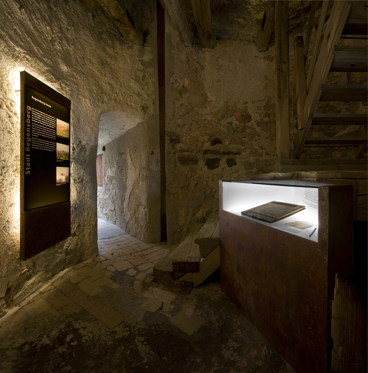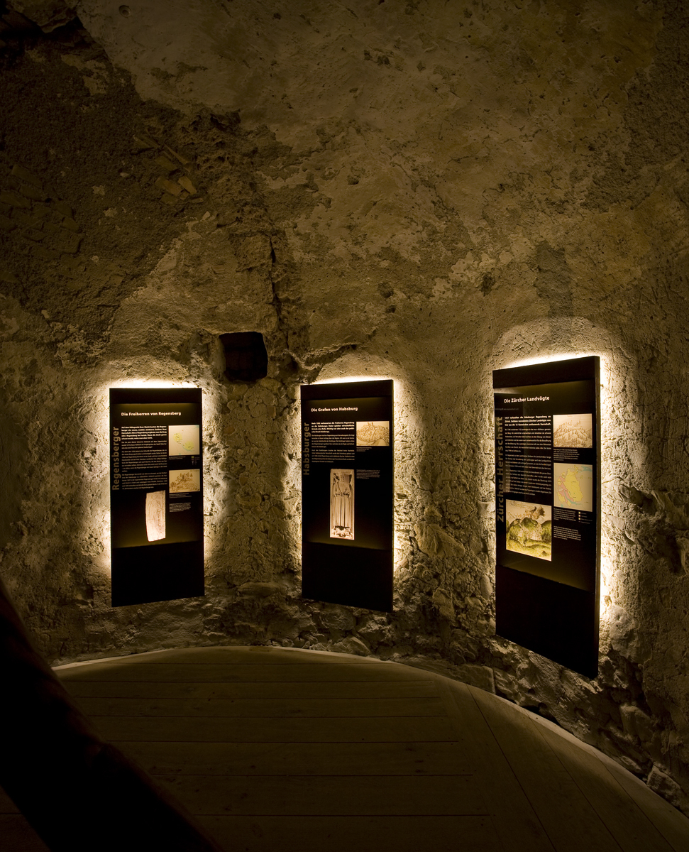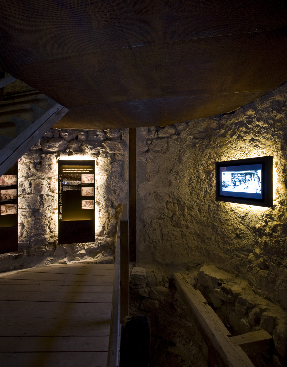Infolge enger Platzverhältnisse im Turminnern wurden die Informationen auf das Wesentliche reduziert. Die Präsentation erfolgt durch einheitlich dimensionierte Panelen wie auch mit Monitoren. Aus den Recherchen entstanden sehr umfangreiche Grundlagen der Historiker, welche in einem Buch umfassend verarbeitet wurden. Der in Regensberg ankommende Besucher wird auf dem Weg zur Oberburg mittels Aussentafeln über die Geschichte und die Ausstellung im Turm vororientiert.
