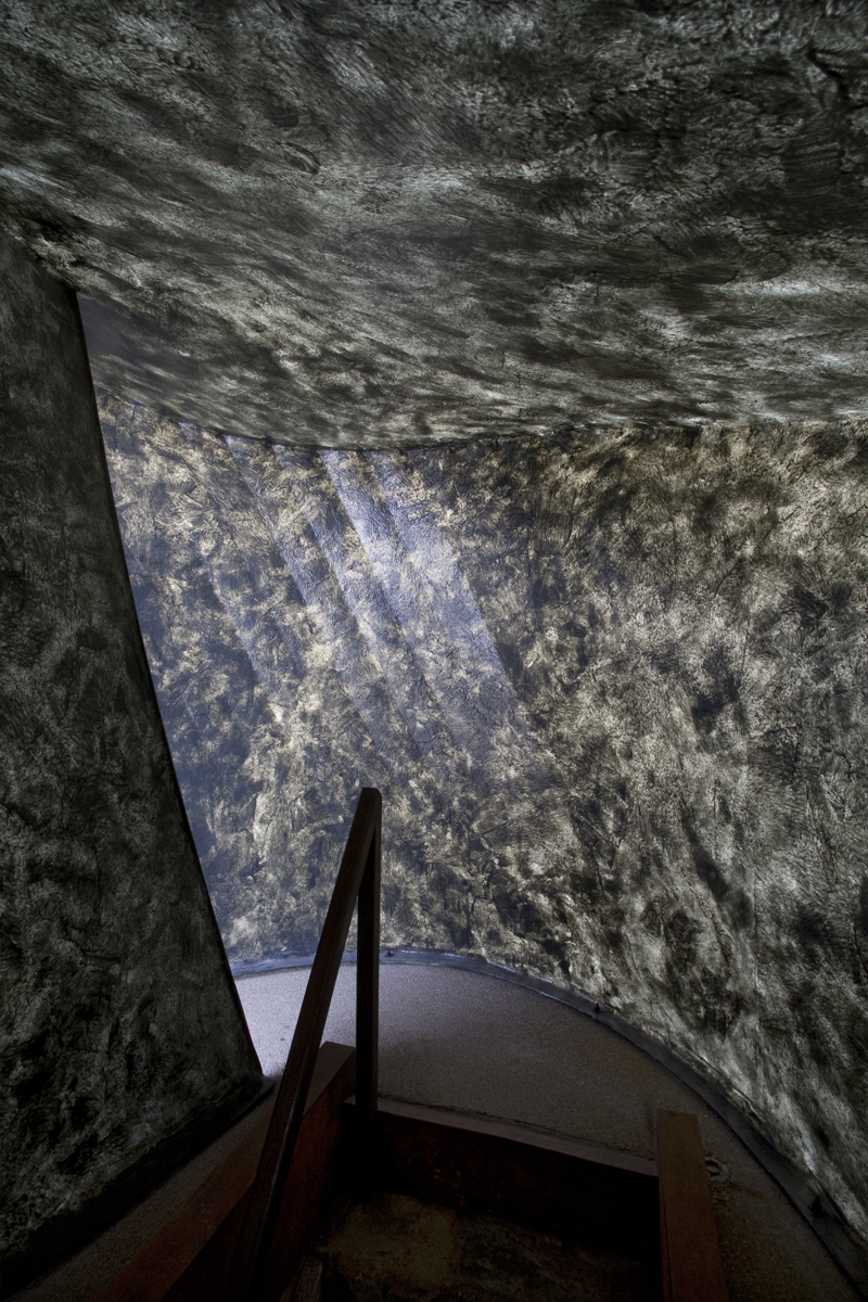 Der Zustand der Turminnenwände wurde nach der Reinigung unverändert belassen. Die Wandoberflächen aber auch die räumliche Qualität der einzelnen Geschosse sind unterschiedlich und kamen dem Konzept, pro Geschoss ein bestimmtes Thema zu dokumentieren, sehr entgegen. Sämtliche Einbauten, Absturzsicherungen, Vitrinen und Panels sind mit rohem Stahl schnörkellos und zeitgemäss konstruiert.