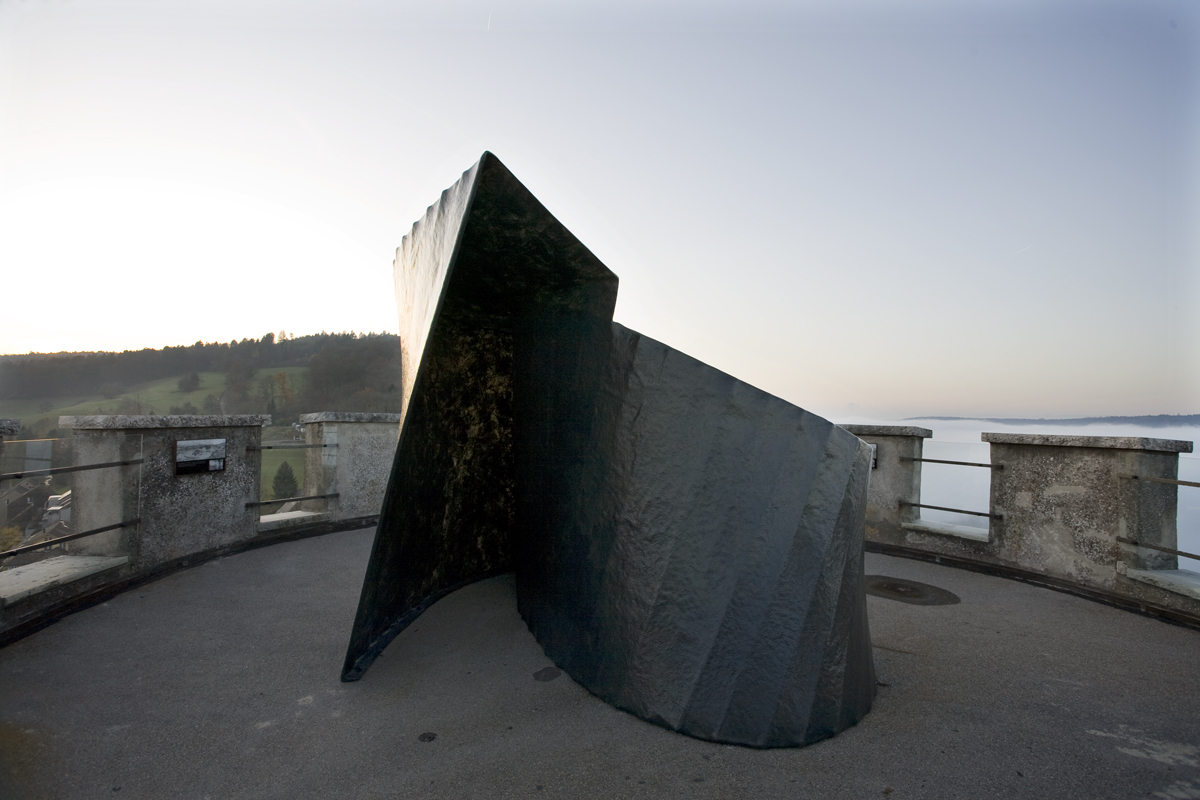 Mit dem Betreten der Zinne wird man endgültig mit der Neuzeit konfrontiert. Mit dem neuem Turmaufgang wurde ein Bezug zum inneren Freiraum der Oberburg hergestellt. Die Materialisierung mit Fiberglas sowie die Volumetrie erinnert aber auch an ein Schneckengehäuse, dessen versteinerte Formen auch in den Zinnenabdeckungen zu entdecken sind. Diese zeitgemässe Interpretation des wettersicheren Ausstiegs auf die Zinne wird ergänzt durch die Absturzsicherungen in Glas und den Orientierungstafeln der verschiedenen Ausblicke. (Text: Architekten)