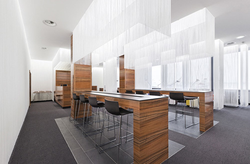 „Dadurch sind die Nutzungsinseln zwar klar ablesbar, aber zugleich sind auch ein guter Überblick und ein hohes Maß an Orientierbarkeit gegeben“, berichten die Architekten. Das Maß an Privatheit nimmt mit der Tiefe des Raumes zu, d.h. Personen mit kurzer Aufenthaltsdauer halten sich intuitiv eher im vorderen Bereich auf, und Passagiere mit längerer Verweildauer können sich in den ruhigeren Bereich der Lounge zurückziehen. (Text: Gabriele Kaiser)