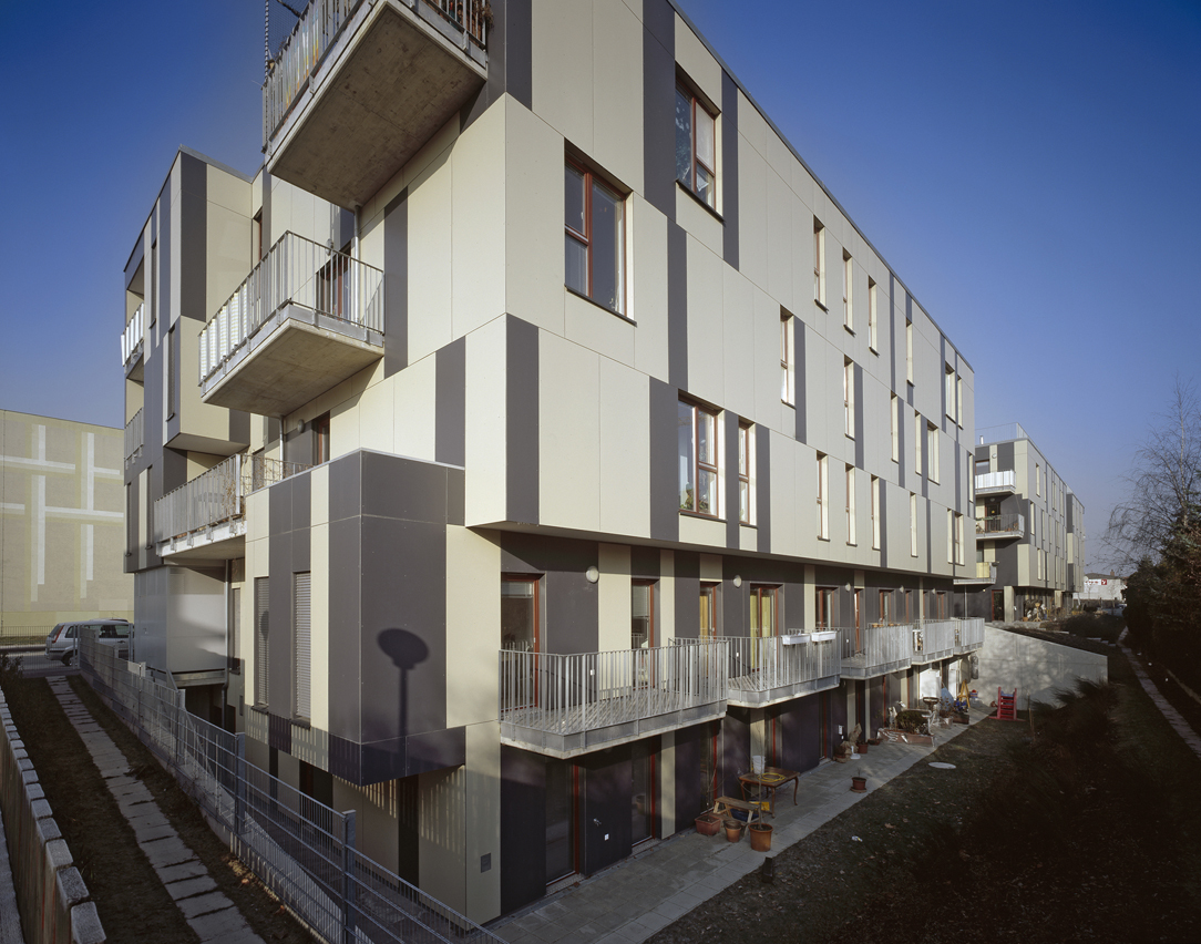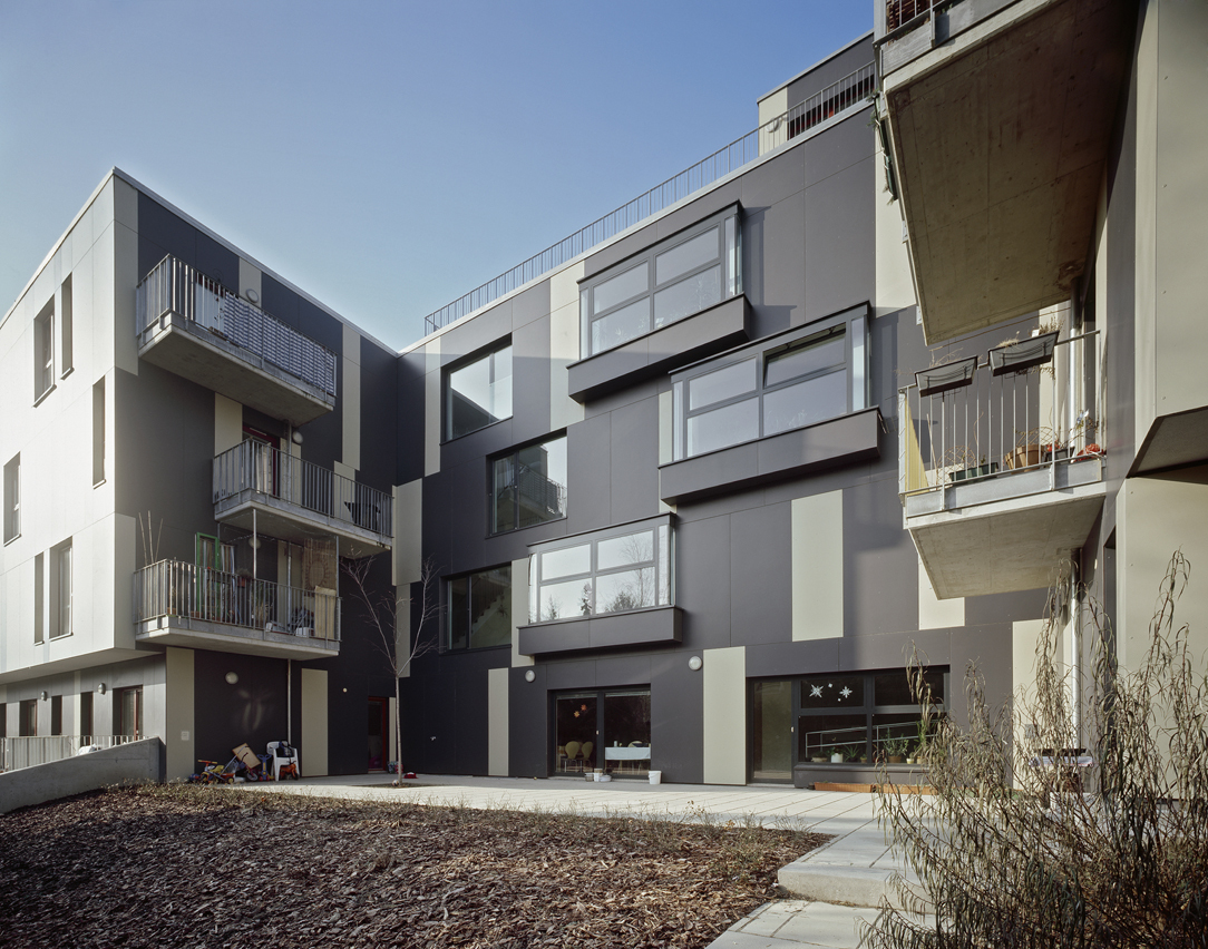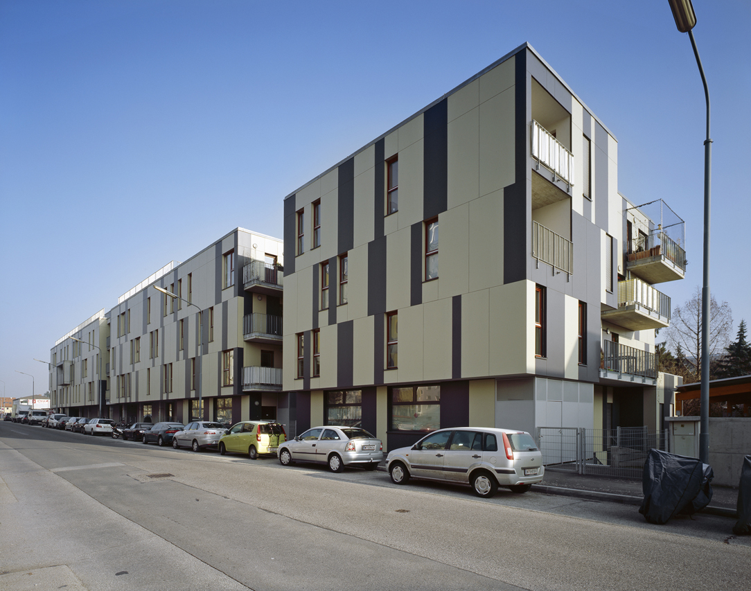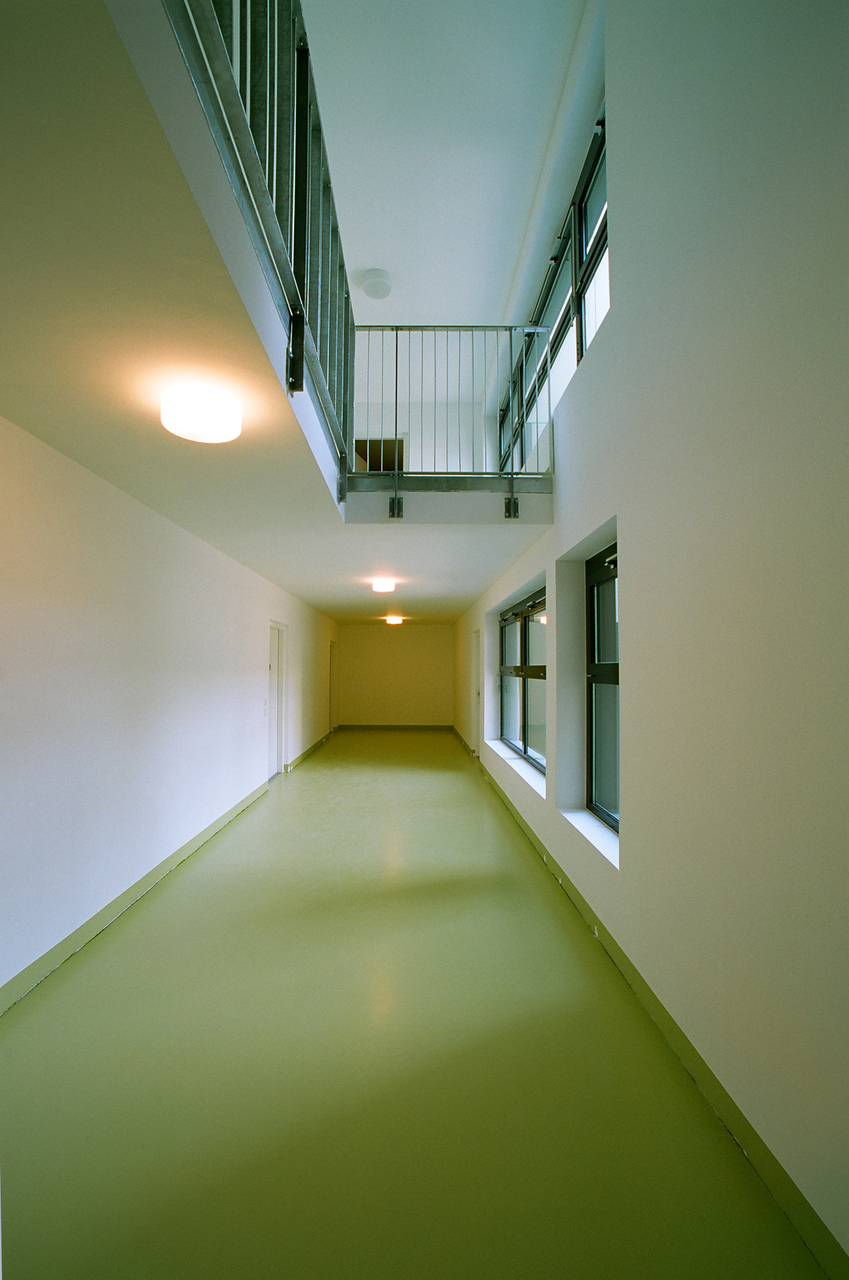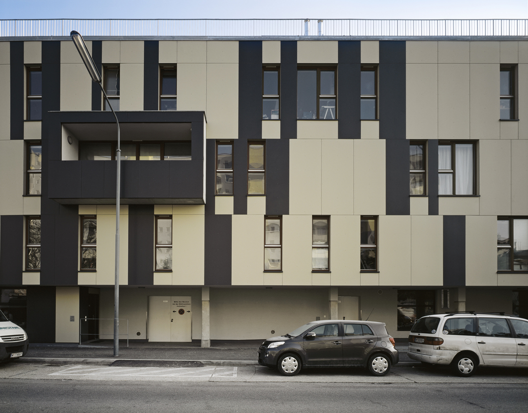 Kernbereich des langgestreckten Gebäudes mit mehrfachen Hofeinschnitten ist eine drei Meter breite, über zwei führende Treppen erschlossene Passage, die in ihrer differenzierten Räumlichkeit und Belichtung (besonders schön die Blumenfenster mit ihren tiefen Laibungen) viel mehr bietet als eine herkömmliche Mittelgangerschließung. Der wohnliche Flur ist nicht die einzige Begegnungszone, zahlreiche Gemeinschaftseinrichtungen (Werkstatt, Fahrrad- und Kinderwagengarage, Workshopraum mit Gemeinschaftsküche und Gemeinschaftsterrasse, Büro mit Bibliothek Waschküche, Sauna mit Ruheraum etc.) ergänzen das Raumangebot. Die Vielfalt der Wohn-Typologien wird durch eine maximale Freiheit innerhalb der Wohnungen noch erhöht. Dazu die Architektin: „Die weitgehend in Säulen aufgelöste Konstruktion ist unabhängig von Wohnungstrennwänden positioniert und erlaubt eine nachträgliche Veränderung für veränderte Lebensumstände. Vom 1-Feldtypus (Miniapartment), dem 1,5-Feldtypus (Single), dem 2-Feldtypus (Double oder Alleinerzieherin), dem 3-Feldtypus (Familie, Patchworkfamilie oder SeniorInnengemeinschaft) bis zum 4-Feldtypus (3-Generationenwohnung) werden alle denkbaren Wohnformen angeboten, wobei alle Wohnungen entweder als Einraum- oder Loftwohnungen oder als Zimmerwohnung organisert werden können.“ Im Sinne einer Maximierung der Wohnbereiche wurden alle Nebenräume in einer linearen Servicezone mit Stauraum, Bad und WC entlang der Passage (1,55 m breit) angeordnet. Mit seinen drei Wohnhöfen ist die Kubatur in kleinmaßstäbliche Einheiten gegliedert, eine zweifärbige Fassade aus Faserzementplatten bringt zusätzliche Individualisierung ins Spiel. Das gleichermaßen rationale wie elastische Konzept gibt allen erdenklichen Wohnformen Raum – die Bewohnerinnen werden ihn gewiss zu nutzen wissen. (Text: Gabriele Kaiser)