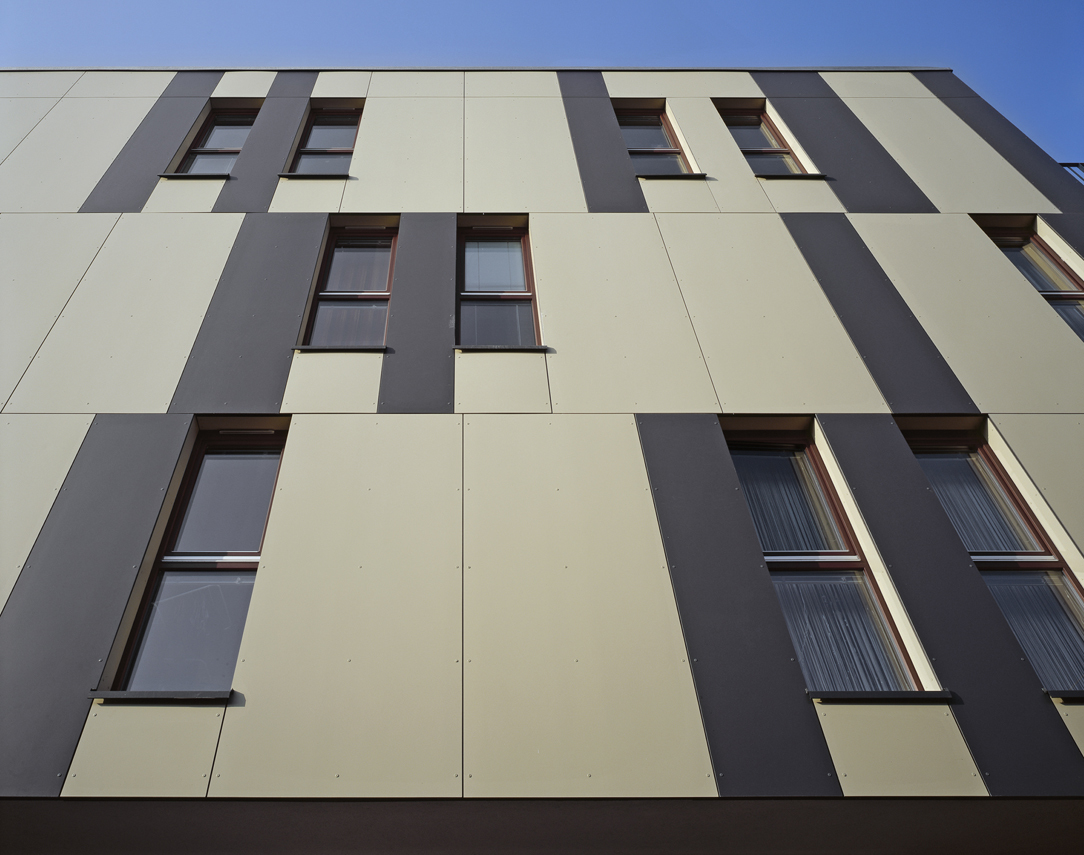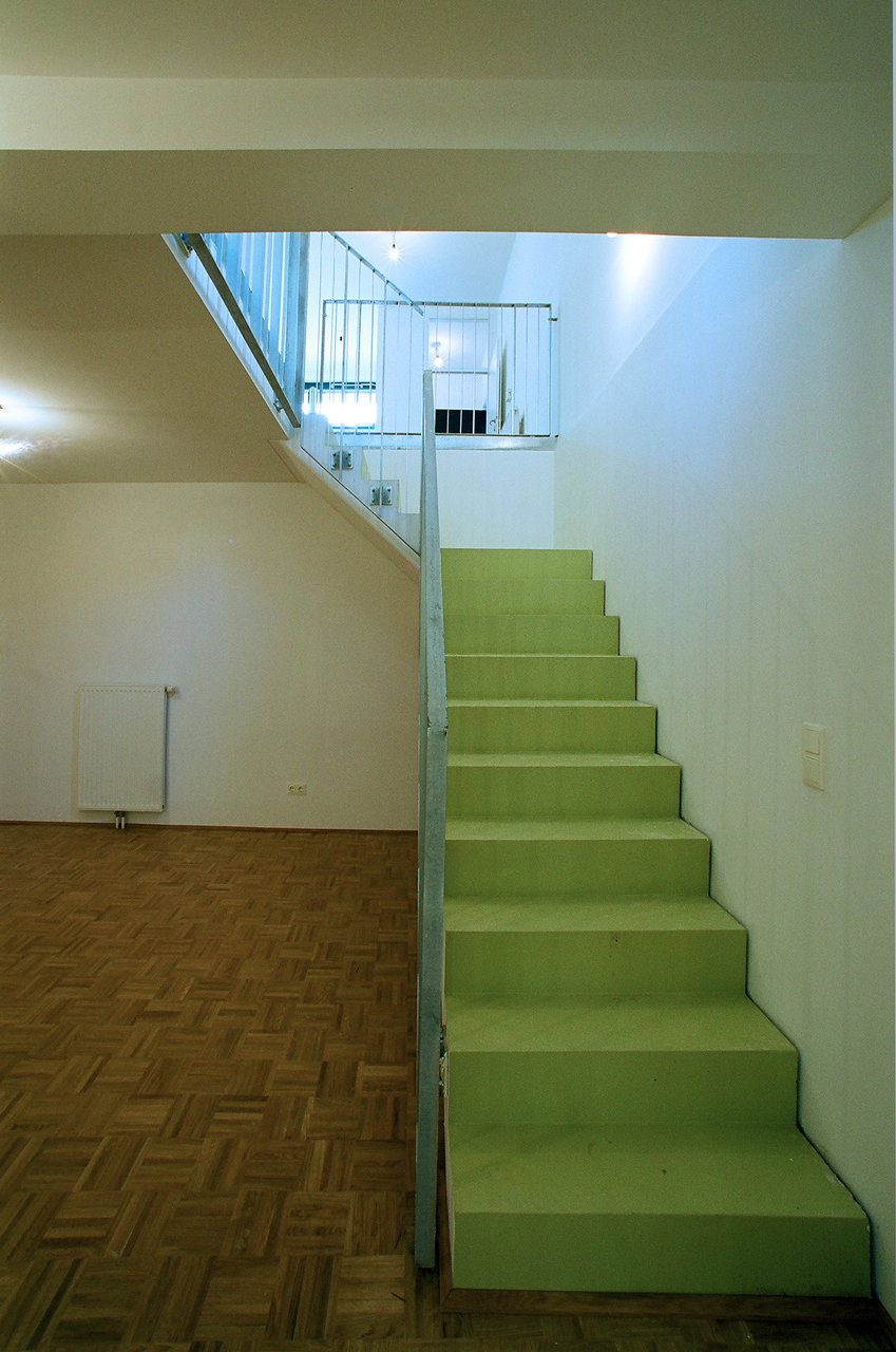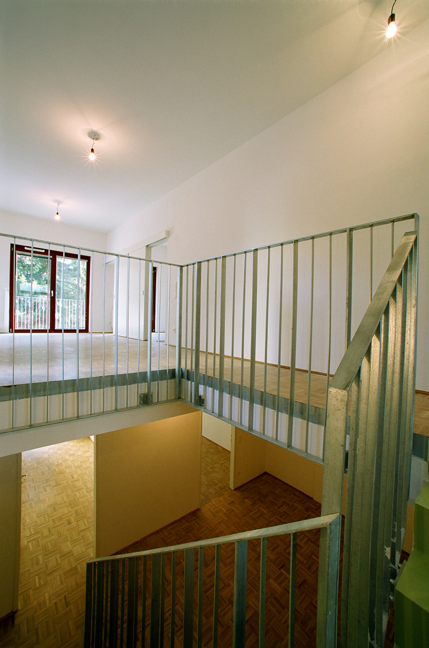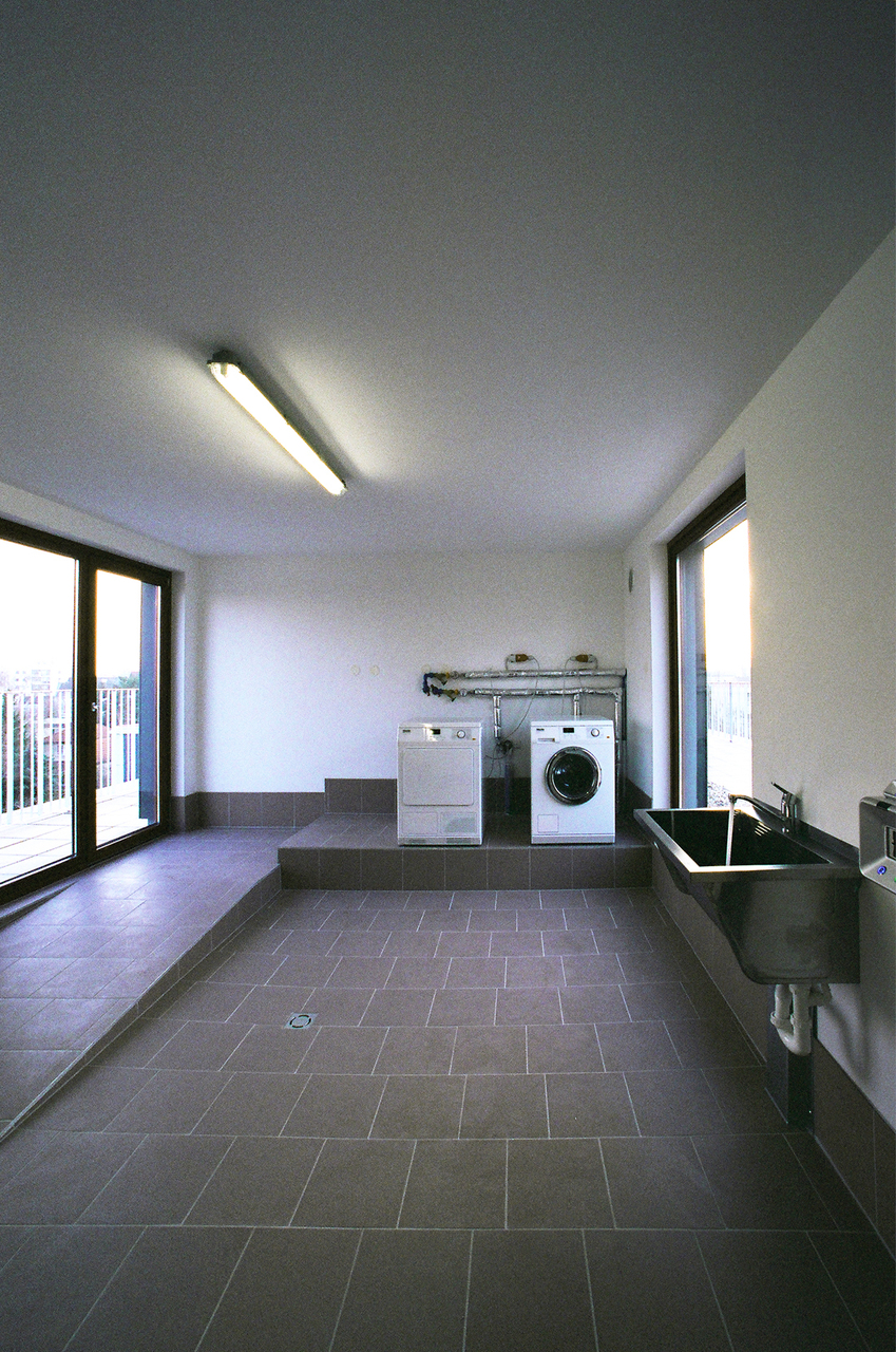 Kernbereich des langgestreckten Gebäudes mit mehrfachen Hofeinschnitten ist eine drei Meter breite, über zwei führende Treppen erschlossene Passage, die in ihrer differenzierten Räumlichkeit und Belichtung (besonders schön die Blumenfenster mit ihren tiefen Laibungen) viel mehr bietet als eine herkömmliche Mittelgangerschließung. Der wohnliche Flur ist nicht die einzige Begegnungszone, zahlreiche Gemeinschaftseinrichtungen (Werkstatt, Fahrrad- und Kinderwagengarage, Workshopraum mit Gemeinschaftsküche und Gemeinschaftsterrasse, Büro mit Bibliothek Waschküche, Sauna mit Ruheraum etc.) ergänzen das Raumangebot. Die Vielfalt der Wohn-Typologien wird durch eine maximale Freiheit innerhalb der Wohnungen noch erhöht. Dazu die Architektin: „Die weitgehend in Säulen aufgelöste Konstruktion ist unabhängig von Wohnungstrennwänden positioniert und erlaubt eine nachträgliche Veränderung für veränderte Lebensumstände. Vom 1-Feldtypus (Miniapartment), dem 1,5-Feldtypus (Single), dem 2-Feldtypus (Double oder Alleinerzieherin), dem 3-Feldtypus (Familie, Patchworkfamilie oder SeniorInnengemeinschaft) bis zum 4-Feldtypus (3-Generationenwohnung) werden alle denkbaren Wohnformen angeboten, wobei alle Wohnungen entweder als Einraum- oder Loftwohnungen oder als Zimmerwohnung organisert werden können.“ Im Sinne einer Maximierung der Wohnbereiche wurden alle Nebenräume in einer linearen Servicezone mit Stauraum, Bad und WC entlang der Passage (1,55 m breit) angeordnet. Mit seinen drei Wohnhöfen ist die Kubatur in kleinmaßstäbliche Einheiten gegliedert, eine zweifärbige Fassade aus Faserzementplatten bringt zusätzliche Individualisierung ins Spiel. Das gleichermaßen rationale wie elastische Konzept gibt allen erdenklichen Wohnformen Raum – die Bewohnerinnen werden ihn gewiss zu nutzen wissen. (Text: Gabriele Kaiser)