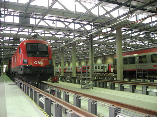 Die Hallen für die Blockzugwartung, die Reparatur von Reisezugwagen und Triebfahrzeugen, den Komponententausch und die technische Reinigung sowie die Lokabstellung wurden zu einem Hallenverband zusammengeführt. Die Hallenkonstruktion besteht aus Stahlbetonfertigteilstützen, das Hallendach wurde als Sheddach aus Holzfachwerksträgern und Holzdachelementen ausgebildet. Die Lichtbänder des Sheddaches ermöglichen eine gleichmäßige natürliche Belichtung der Hallenbereiche. Nördlich der Blockzughalle sind zwei ca. 100 m lange 3-gleisige Hallen situiert, die östliche ist die Reparaturhalle für Reisezugwagen und Triebfahrzeuge (Lok- und Wagenhalle) des Geschäftsbereiches ÖBB Technische Services. Eine weitere ca. 100 m lange 3-gleisige Halle für ÖBB TR ist im Nordwesten des Hallenverbandes situiert. Um die maximale Fluchtwegslänge in den Hallen einzuhalten, werden 3 Fluchttunnel mit Abgängen zwischen den Gleisen unter den Hallen situiert. Im Verband mit dem westlichen und östlichen Fluchttunnel wird je ein Medienkollektor geführt, der die Haustechnikzentralen mit den Entnahmestellen in den Hallen verbindet. Zwei weitere kleinere Hallen befinden sich auf dem Betriebsareal, die eine beherbergt eine Unterflurrassatzdrehbank, die andere den Hilfszug der ÖBB. (Text: Architekten)