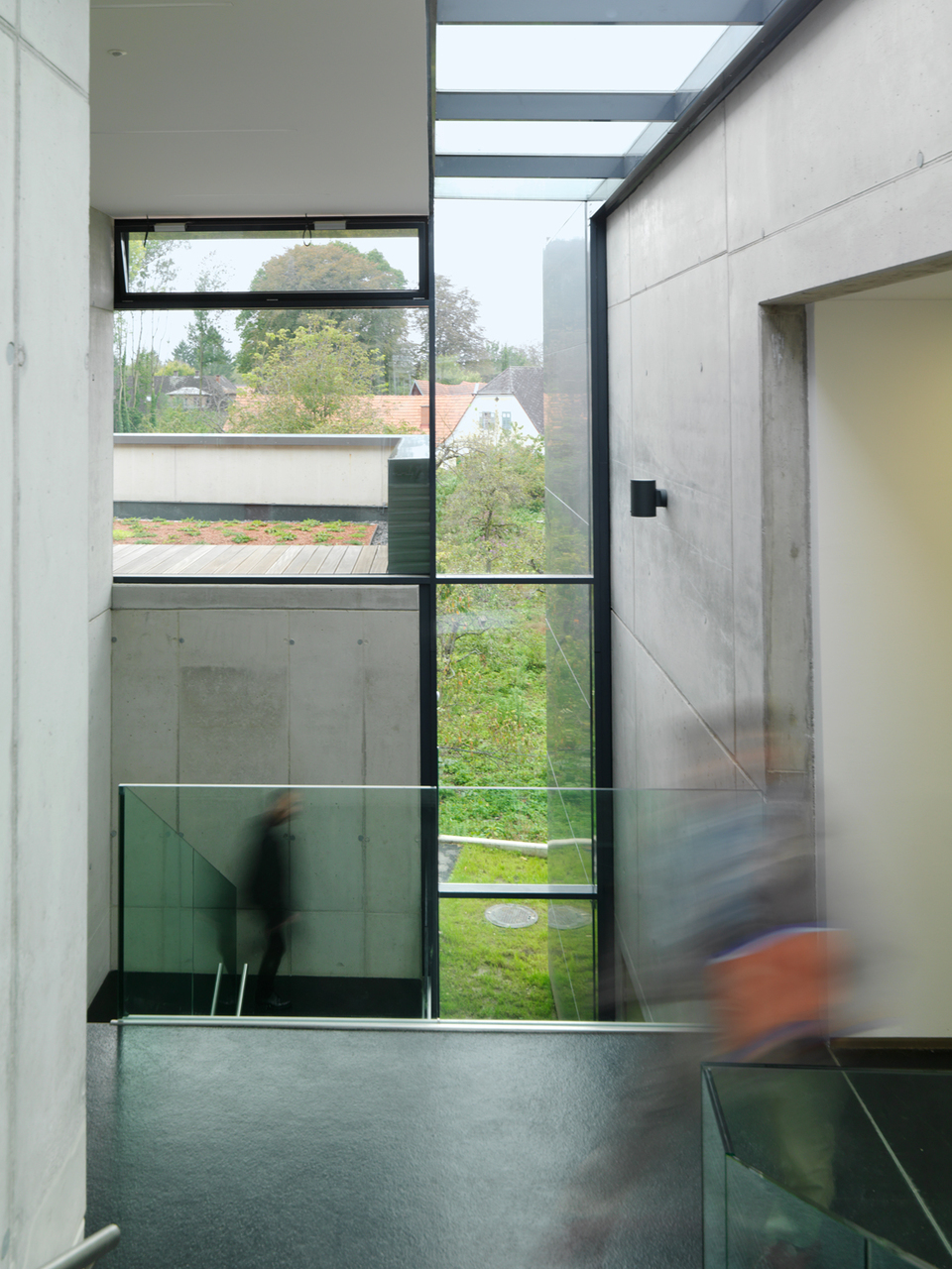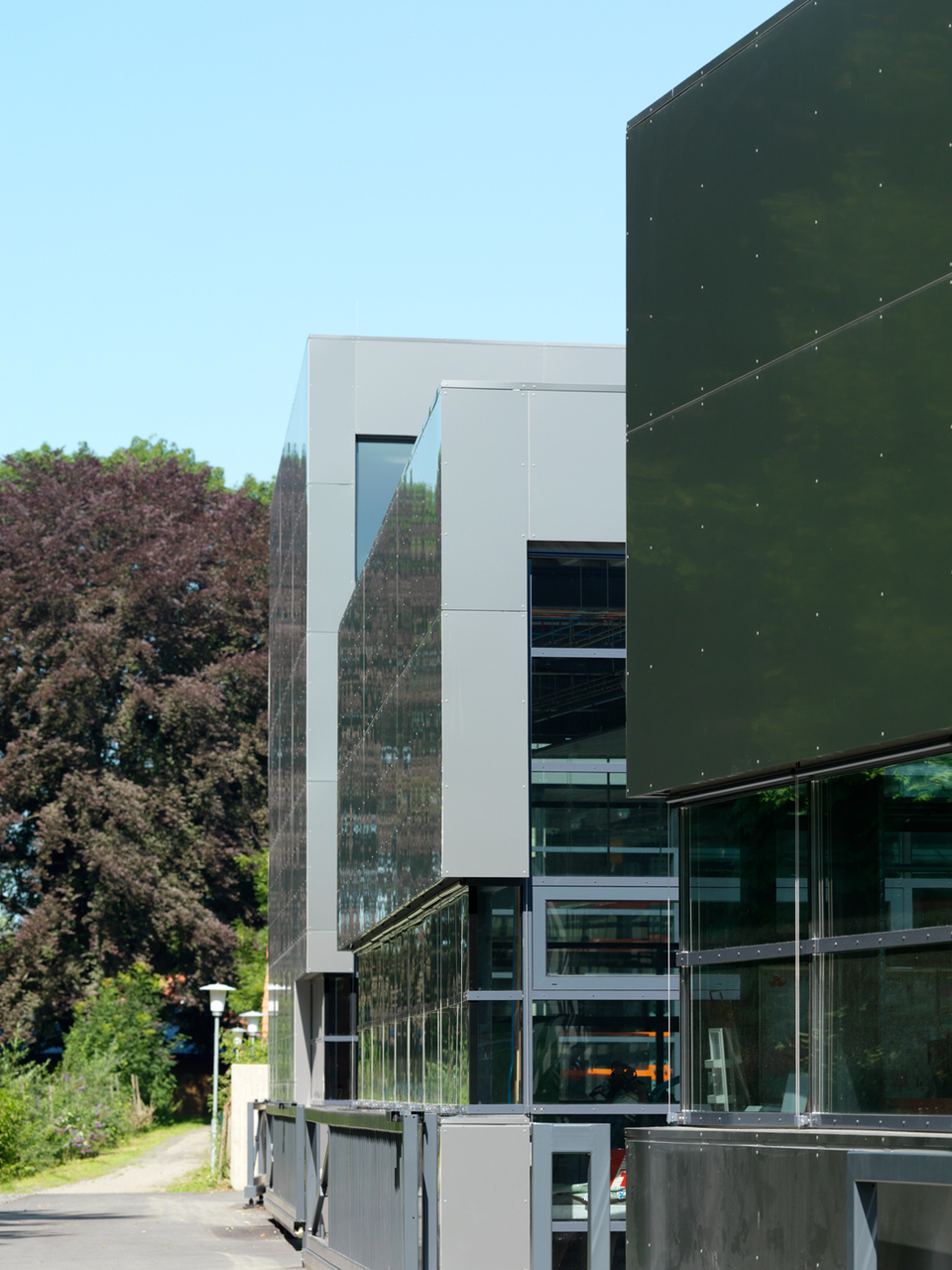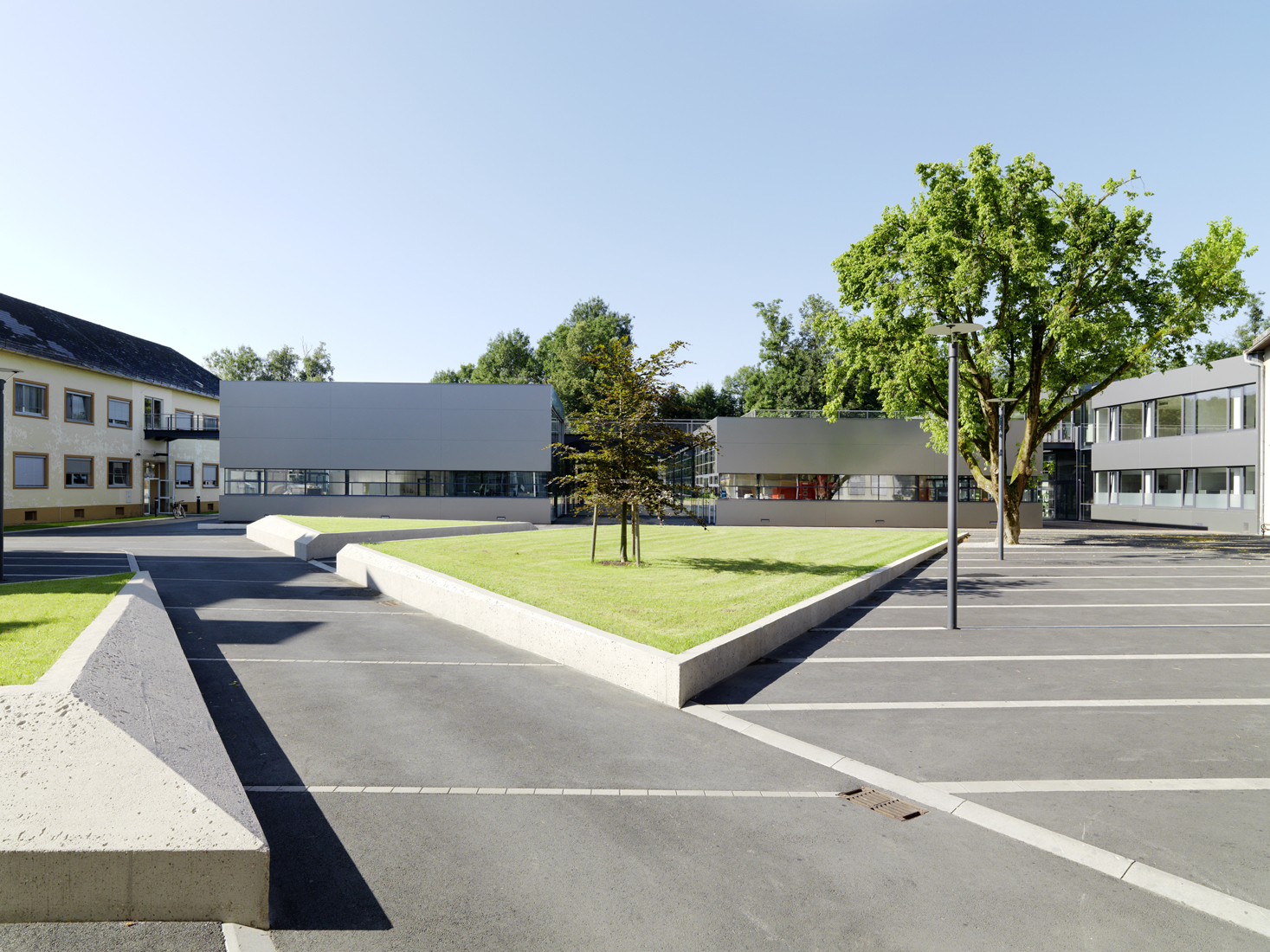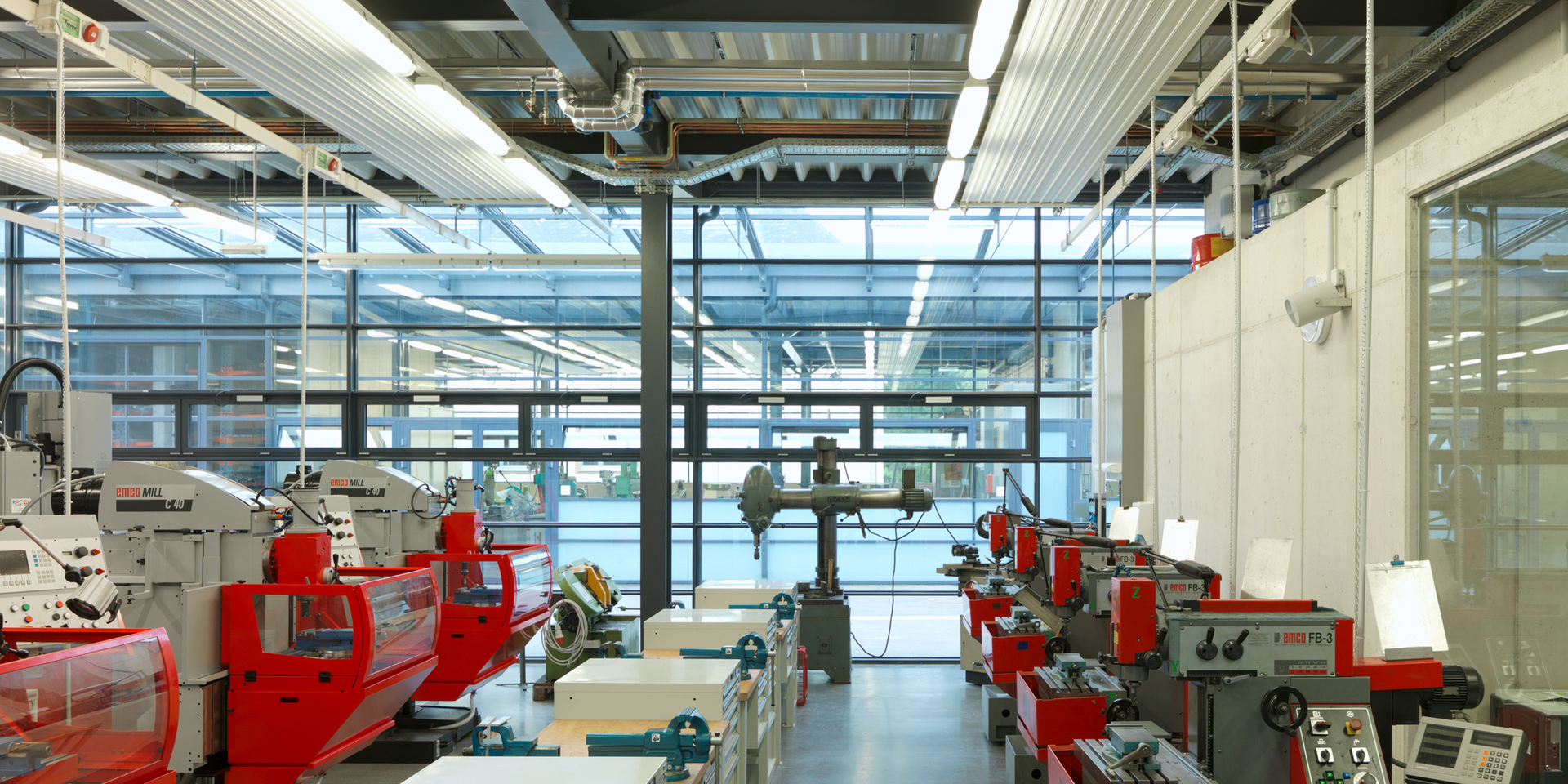 Das westlich gelegene Werkstättengebäude verfügt über ein Obergeschoß, in dem Labors untergebracht sind. Eine Erschließungsachse verbindet die Direktion im Osten mit den neuen Werkstättengebäuden. Im Westen endet sie im neuen Pausenbereich, der zum Klassentrakt, weiterführt. Dieser neue Pausenbereich liegt an der Schnittstelle zwischen den Klassenräumen, den Labors und den Werkstätten und stellt einen fließenden Übergang zum verkehrsfreien Innenhof mit dem alten Baumbestand her, der flexibel nutzbar ist.