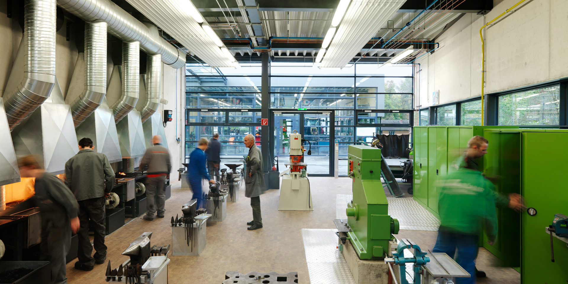 Das Erscheinungsbild der neu errichteten Gebäude korrespondiert mit der geplanten Nutzung. Im Hinblick auf die Ausbildung Metall verarbeitender Handwerker kommen weitgehend berufsspezifische Materialien und Konstruktionsweisen zur Anwendung. Der Charakter einer Werkhalle ist ablesbar, die Struktur der Gebäude und die Begrünung der Dächer gewährleisten einen harmonischen Übergang zur benachbarten Naturlandschaft. Die Freiflächen zwischen den Werkstättengebäuden sind mit leichten, transparenten Dächern überspannt und schaffen offene, licht durchflutete Räume. (Text: Ute Angeringer-Mmadu nach einem Text der Architekten)