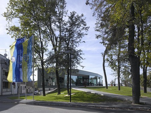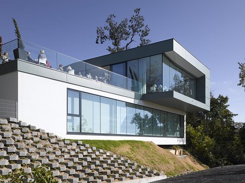 Mit einer kleinen Verzögerung gegenüber den großen Weinbaugebieten des Burgenlandes und der Steiermark, wo sich um die Jahrtausendwende viele Winzer – meist dank der Unterstützung durch großzügige EU-Förde - rungen – dazu entschieden, architektonisch ambitionierte Betriebsgebäude zu errichten, erreichte der Trend, Architektur als Teil der Vermarktungsstrategie einzusetzen, auch Niederösterreich.In der Gebietsvinothek von Kirchberg am Wagram präsentieren und vermarkten über fünfzig ausgewählte Winzer der Region ihre Weine. Neben Flächen für Degustation, Verkauf und Lagerhaltung beherbergt das Gebäude auch einen Gastronomiebetrieb, Veranstaltungsräume und ein Tourismusbüro. Die Architekten situierten den zweigeschossigen Baukörper im Süden eines Parks mit altem Baumbestand, der nach Westen etwa 10 Meter steil in einen Graben abfällt. Das Parkgelände wurde derart modelliert, dass es vom bereits bestehenden Parkplatz zum verglasten Erdgeschoss sanft überleitet und das Gebäude in der Umgebung aufgeht.