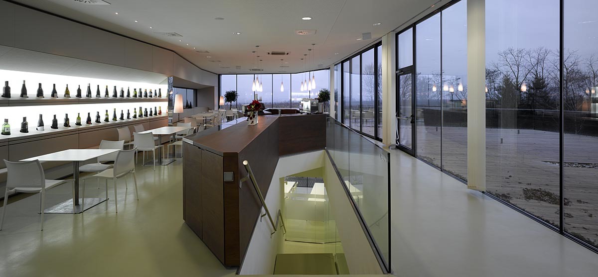 Das an drei Seiten raumhoch verglaste Hauptgeschoss weist einen Rücksprung auf, entlang dem die Zugangsrampe unter Dach ins Innere führt. In der Mittelachse unterteilt ein Barmöbel den Raum in einen Degustationsund Verkaufsbereich und einen vom „schnellen Geschäft“ unbehelligten Restaurantteil. An die Rückwand schmiegt sich ein in die Wand integriertes Möbel, das hinterleuchtete Präsentationsflächen, Ausziehtablare und Laden enthält und im Restaurantbereich in eine Sitzbank übergeht. Dahinter gibt ein Fenster mit tiefer Laibung Ausblick in die Landschaft. Im schmäleren östlichen Bereich liegt auf gleicher Ebene das Tourismus- und Regionalbüro. Die Bar umfängt den Abgang ins Untergeschoss, wo nach Westen in den Seminarräumen die Glasfassade den Blick in die Weingärten freigibt. Ins Gelände integriert und damit introvertierter liegen die Küche und das Weinlager. Das dichte Raum- und Funktionsprogramm fand in einem bemerkenswert kompakten Baukörper Platz, der mit Sensibilität an einer topografisch reizvollen Stelle platziert wurde. Im Gegensatz zu vielen marktschreierischen Elaboraten zeitgeistiger Weinarchitektur gelang hier ein Haus, bei dem bei aller Signifikanz und Aktualität nicht darauf vergessen wurde, Landschaft und Dorfstruktur Respekt zu zollen. (Text: Franziska Leeb)