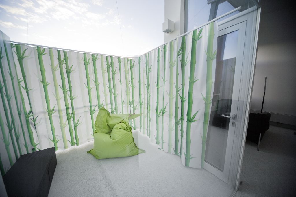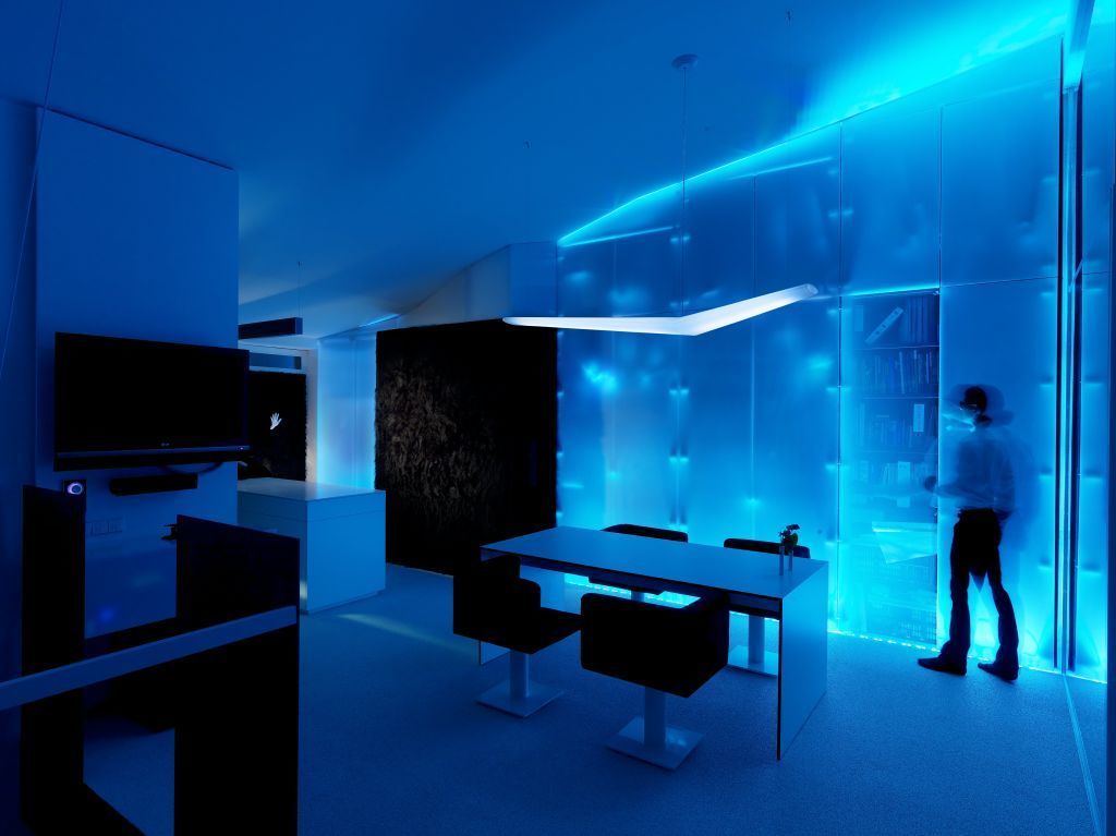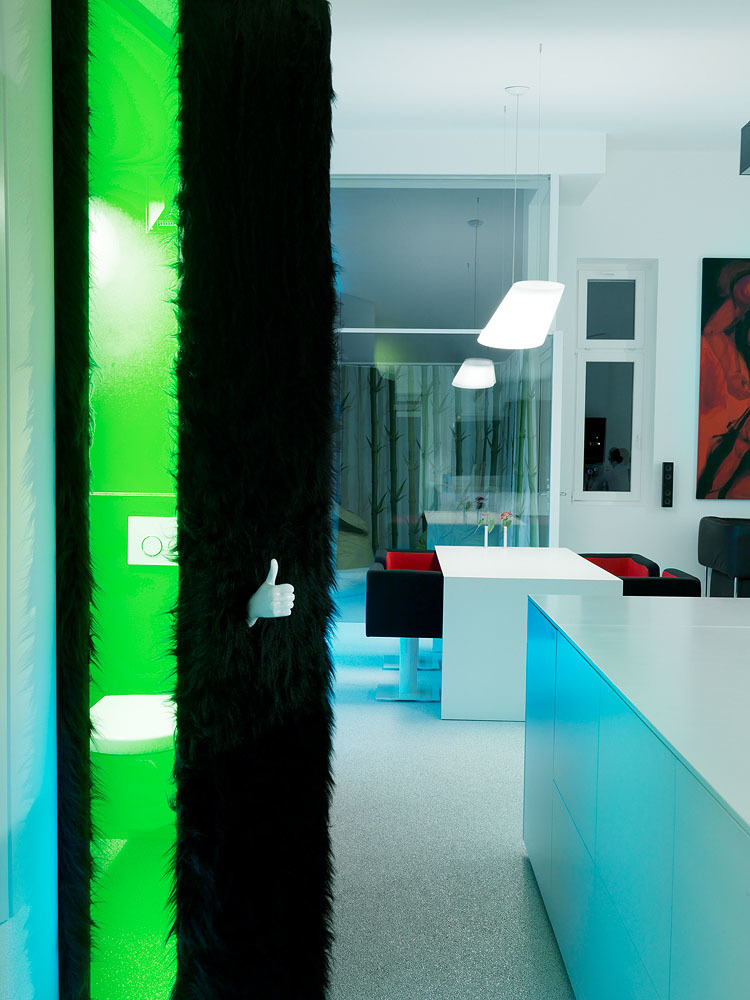 Über die gesamte Tiefe und Höhe des Raums erstreckt sich ein Stauraum, der auch eine innen ganz in Froschgrün gehaltene Toilette beherbergt. Die Front aus Plexiglas ist in der Glasebene mit LEDs beleuchtbar, wodurch der gesamte Raum in beliebige Farben getaucht werden kann. Wenn gerade nicht gekocht wird, verschwindet die Küche hinter einer, diesmal mit schwarzem Fell bezogenen Faltwand, die Kochfelder des freistehenden Kochkubus können einfach zugeschoben werden.