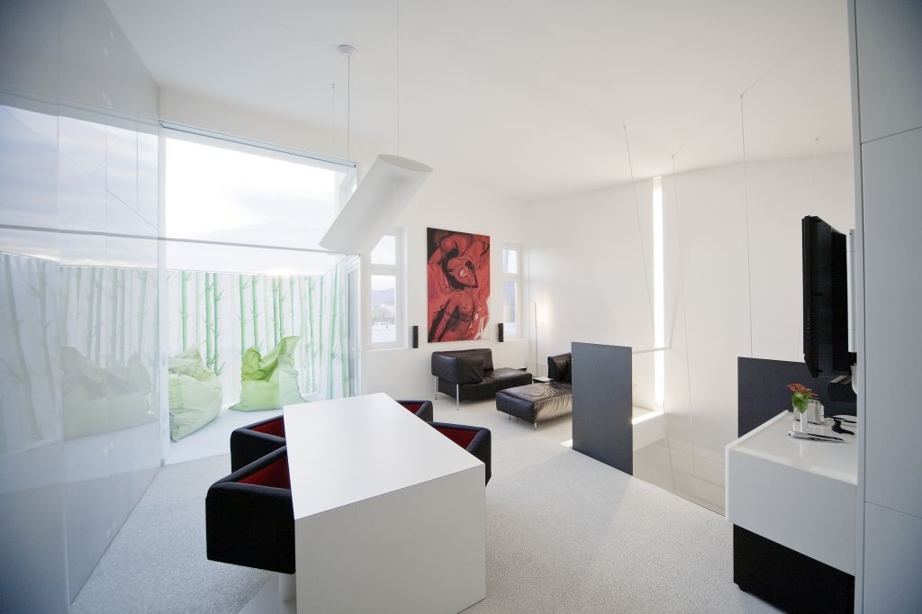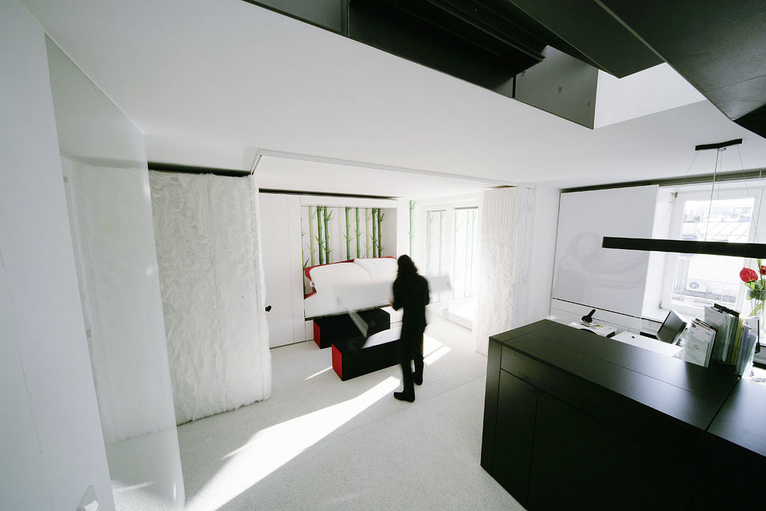 Durch das Vertauschen von Wohn- und Schlafebene erhält der nun oben gelegene Wohnbereich mehr Licht und durch den weiten Blick nach Westen eine penthouseartige Atmosphäre, während im unteren Geschoß eine zunächst ungewöhnlich erscheinende Verschränkung von Funktionen stattfindet: Der private Schlafbereich wird untertags durch das Öffnen von Faltwänden, die beidseitig mit weißem, schalldämpfenden Kunstfell bezogen sind, zu einem Teil des Arbeitsbereichs. Der Stoff ist Teil eines klaren Farb- und Materialkonzepts: Sämtliche Flächen sind weiß, während einige Stauraum schaffende Einbauten schwarze Akzente setzen. Analog kontrastiert das weiche Fell mit den harten Oberflächen, wie der Sanitärbox aus satiniertem Glas oder dem weißen Fußboden aus, in Epoxidharz gegossenem Marmorkiesel, der fugenlos die ganze Wohnung durchzieht. Dieser kostengünstige Bodenbelag kann sowohl mit einem lebendigen Funkeln in der Sonne als auch mit einer inkludierten Fußmassage aufwarten.