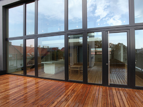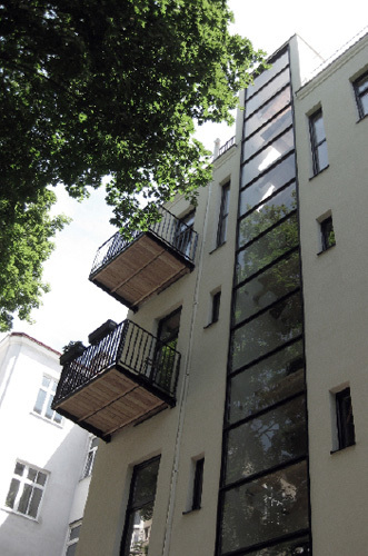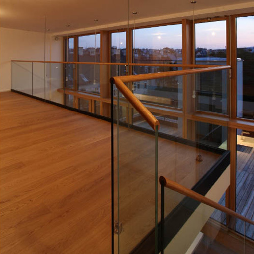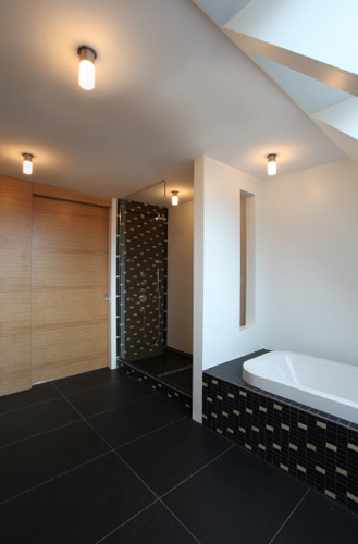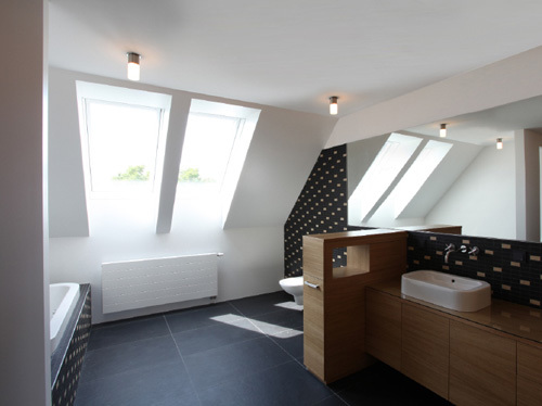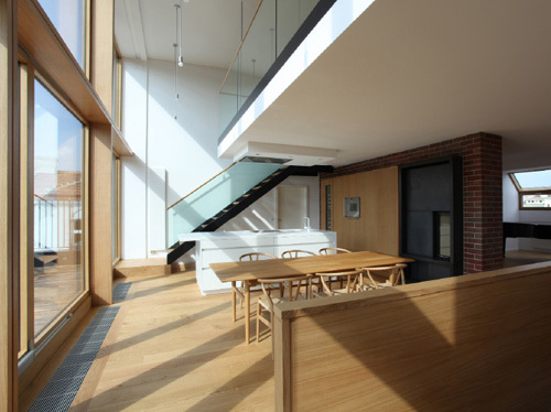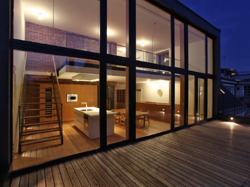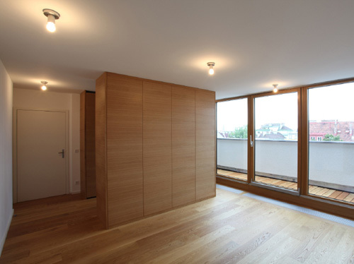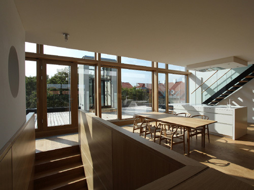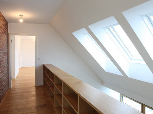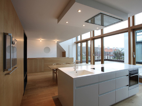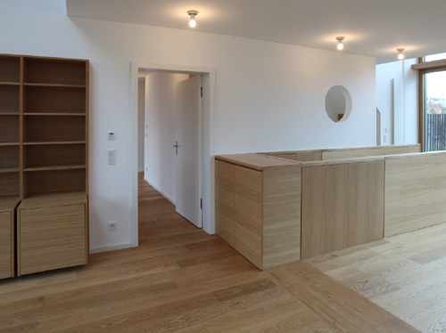 Die größte Veränderung stellt der Dachzubau dar. Das bestehende 30° geneigte Dach wurde abgebrochen und eine auf 45° aufgesteilte Stahl-Holz-Konstruktion errichtet. Durch die besondere Form des Hauses und die daran angepasste Baulinie war es möglich, hofseitig eine zweigeschoßige Aufklappung im Wohnbereich herzustellen, die dem Dachzubau Penthouse-Charakter und echte Großzügigkeit verleiht. Der zweigeschoßige Wohnbereich wurde von Osten (straßenseitig) nach Westen (hofseitig) durchgesteckt und kann sowohl im UG als auch auf Galerieebene durch die Oberlichten und Dachflächenfenster gut durchlüftet werden. Links und rechts vom Wohnbereich liegen auf zwei Ebenen die Schlafräume und im UG die Badezimmer sowie ein Hauswirtschaftsraum, das Gäste-WC und die Garderobe. Die Wohnung zieht sich insgesamt über drei Geschoße, sie wird stiegenhausseitig vom dritten Stock her erschlossen. Die Innentreppe in das UG hinauf wurde als Einbaumöbel mit Abstellraum im dritten Stock und Brüstungsmöbel im Bereich der Wohnküche ausgeführt.