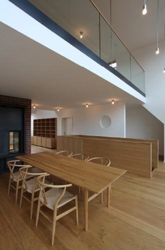 Von den Bauherrn wurde trotz moderner und schlichter Gestaltung eine gemütliche, heimelige Wohnatmosphäre gewünscht. Diese Atmosphäre konnte sowohl mit den Raumproportionen als auch mit den Oberflächenmaterialien erzeugt werden. Als Farben dominieren Eiche natur, schwarz für Stahl, Beton und Fliesen und herbstbunte Klinker für die Mittelmauer. Die Wände wurden weiß gestrichen. Die Möbel wurden großteils Eiche natur furniert und die Innentüren weiß seidenmatt lackiert. Das Galeriegeländer und die Innentreppe wurden als schwarz beschichtete Stahl-Glaskonstruktion mit Eichehandlauf ausgeführt. Die wohnzimmerseitgie Absturzsicherung bildet ein Eiche furniertes Bücherregal. Die Fensterkonstruktionen wurden aus Eiche massiv mit schwarzer ALU-Deckschale ausgeführt, die Dachflächenfenster sind VELUX-Fenster mit Markisetten. Für die Fußböden Eichendielen in den Wohnbereichen und großformatige, schwarze Schieferplatten in den Nassräumen gewählt. Korrespondierend dazu wurde die Mittelmauer / Kaminmauer mit geflammten Klinkern verkleidet und der offene Kamin aus schwarz eingefärbten Betonplatten gebaut.