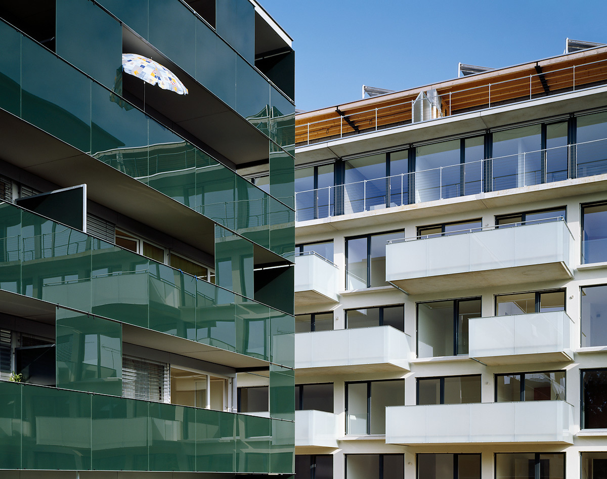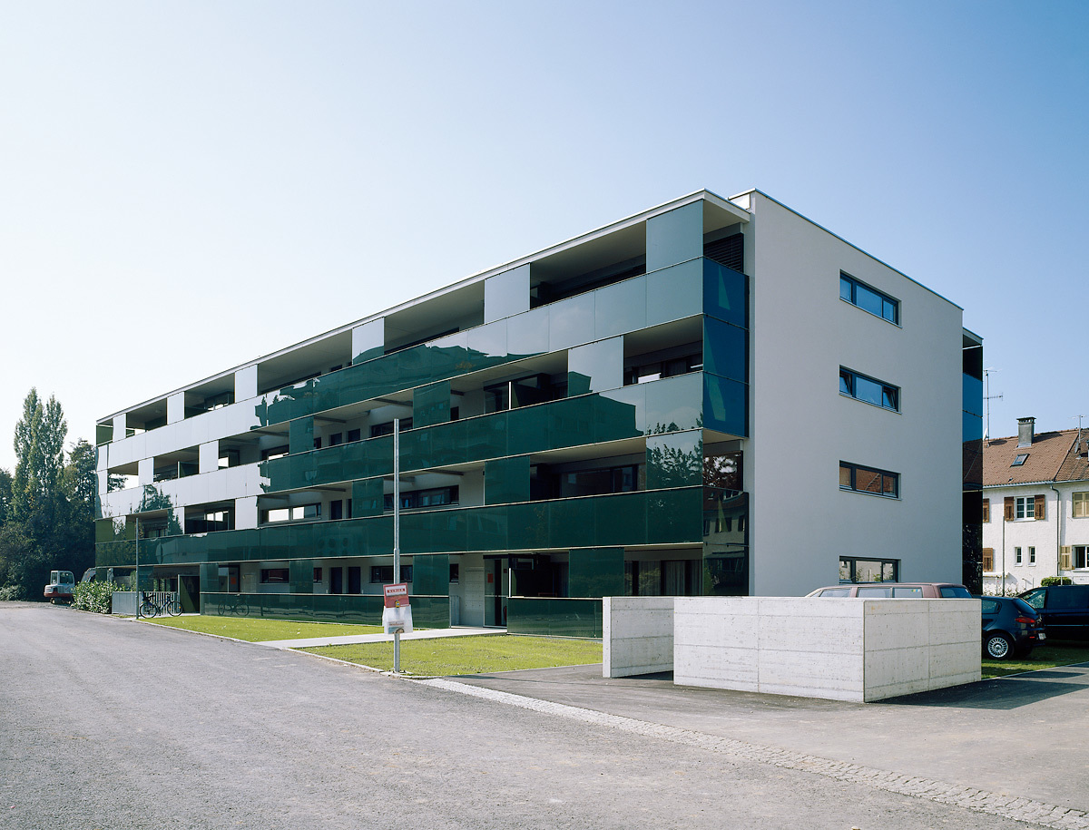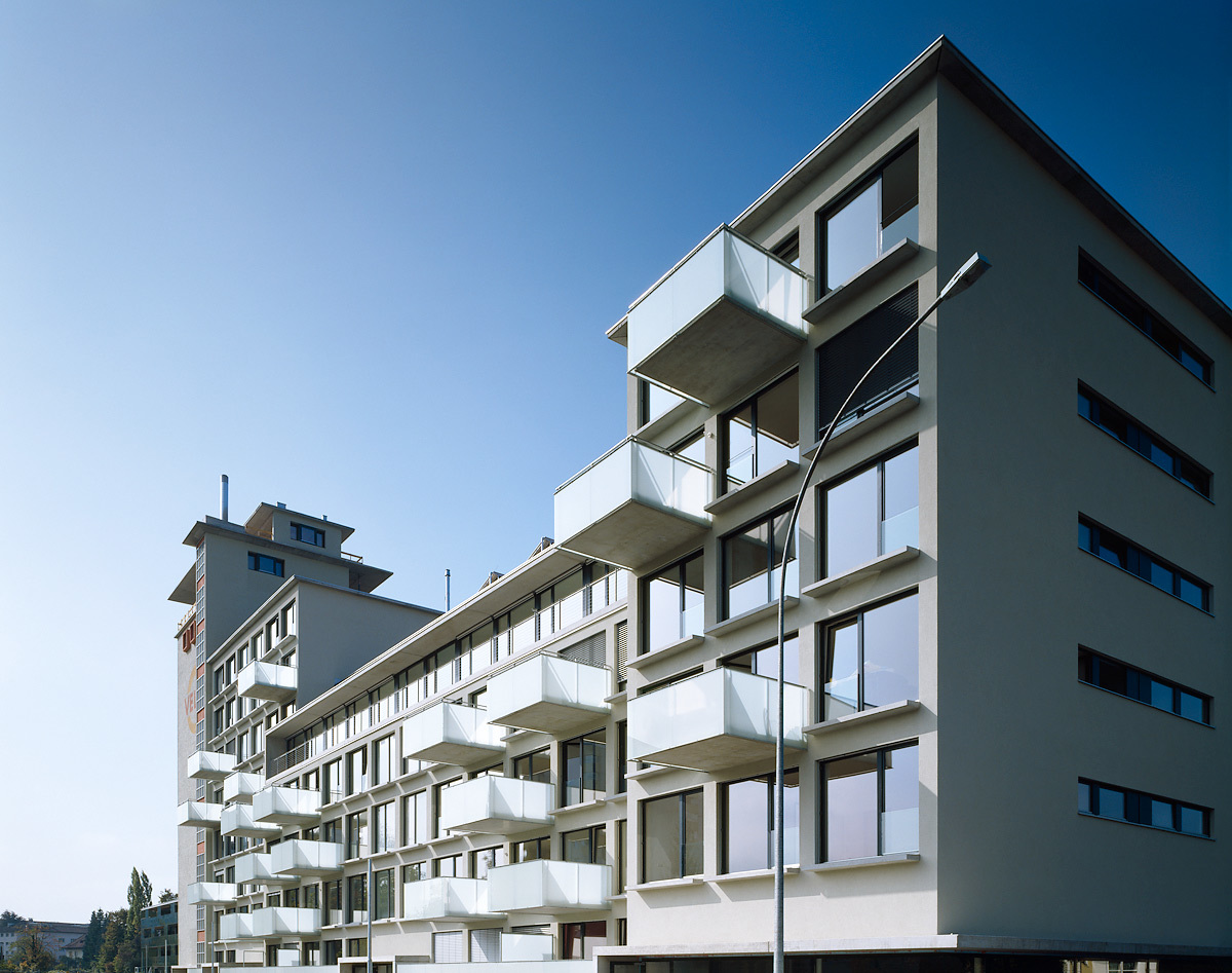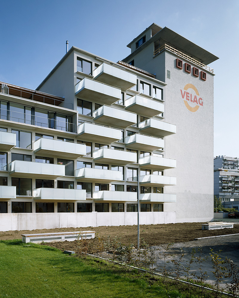 Der südorientierte Neubau ist rational organisiert. Je sechs Kleinwohnungen pro Geschoß mit breiten Loggien nach Süden erschließen sich über den Laubengang. Der nach Osten und Westen orientierte längere Neubautrakt weist eine gute Mischung von Wohnungsgrößen auf, wiederum mit Loggien ausgestattet und zweiseitig belichtet. Es ist die absichtslose, konkrete Figur dieses nicht von formalen Überlegungen bestimmten aber modifizierten Industriebaus, die in ihrer Eigenart identitätsstiftend wirkt. (Text: Martina Pfeifer Steiner)