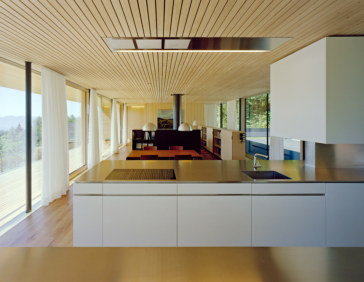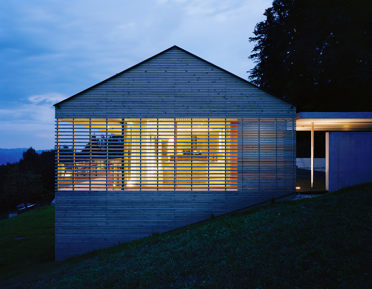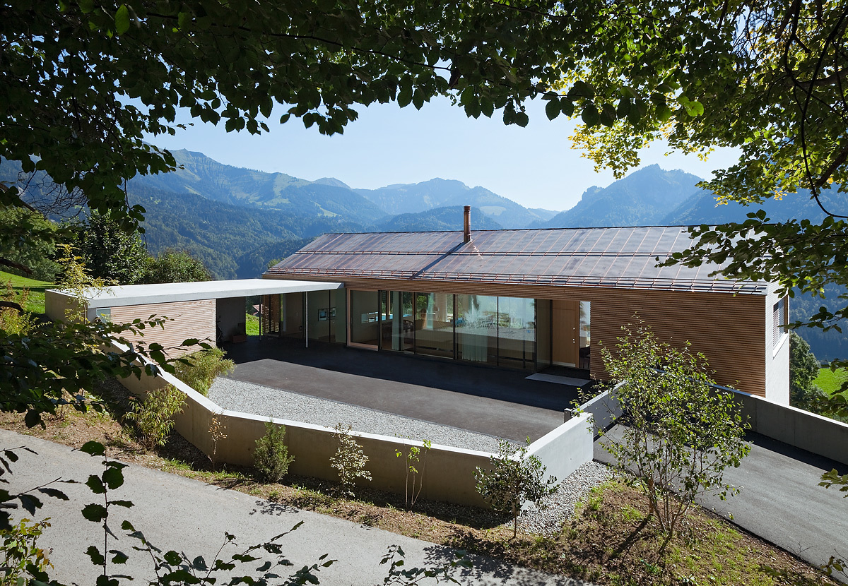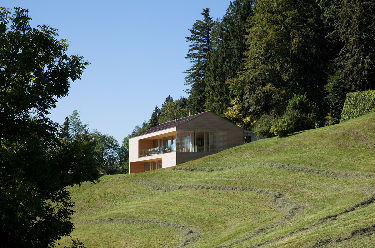 In Kehlegg, einem kleinen Bergdorf oberhalb von Dornbirn, plante das Architekturbüro Dietrich | Untertrifaller ein gleichsam zurückhaltendes wie selbstbewusstes Einfamilienhaus, das sich einfühlsam in die Landschaft einpasst. Parallel zum steil abfallenden Hang schmiegt sich der lange, rechteckige Baukörper in das Gelände. Horizontal verlaufende Weißtanne-Holzlatten bilden die weich wirkende Fassade, die bündig in das flach geneigte Satteldach übergeht.Hangseitig wird zwischen Haus, Carport und Umfriedungsmauer ein geräumiger Hof gebildet, der einen geschützten, ebenen Außenraum und Spielplatz bietet. Von hier aus gelangt man durch den Haupteingang in die Wohnebene des Gebäudes. Zur Rechten befindet sich eine kompakte, nach Westen ausgerichtete Wohneinheit. Zur Linken öffnet sich am Ende des Windfangs ein großzügiger Raum, in dem Wohn-, Ess- und Kochbereich nahtlos ineinander übergehen, wenngleich die einzelnen Zonen durch einen offenen Kamin und Kochinseln klar strukturiert sind. Der an drei Seiten komplett verglaste Raum lässt das Licht und die Natur von Außen nach Innen fließen und macht durch die reduzierte Materialwahl das Gefühl von Leichtigkeit spürbar. Eine einläufige Treppe führt hinab in die Ebene der privaten Räume: hier befinden sich nebeneinander angeordnet die allesamt raumhoch verglasten Schlafzimmer der Eltern und Kinder, sowie Bäder und ein Wirtschaftsraum.