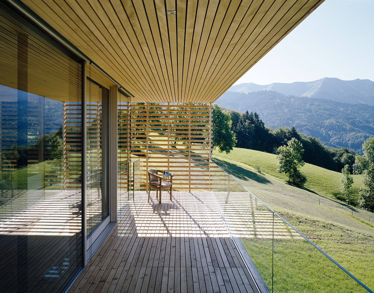 Nach Südwesten – mit Aussicht auf das atemberaubende Bergpanorama – ist in die Fassade ein großflächiger Balkon mit transparenter Brüstung aus Glas und eine Terrasse eingeschrieben. An der südöstlichen Hausseite gelangt man über eine Außentreppe vom Innenhof zu Terrasse und Garten. Die Treppe liegt zwischen Glas- und Holzfassade, die sich hier auflöst und den Ausblick und Lichteinfall filtert.