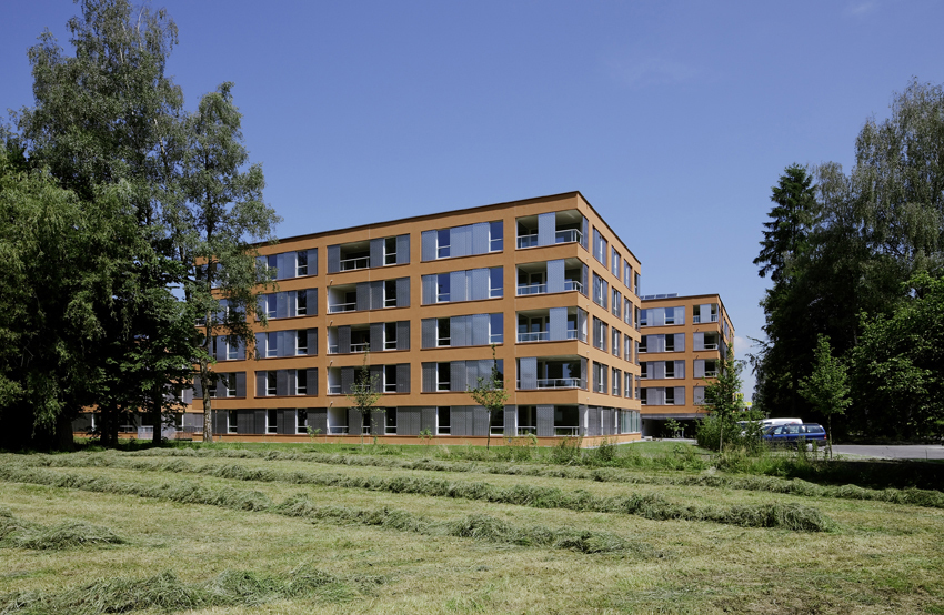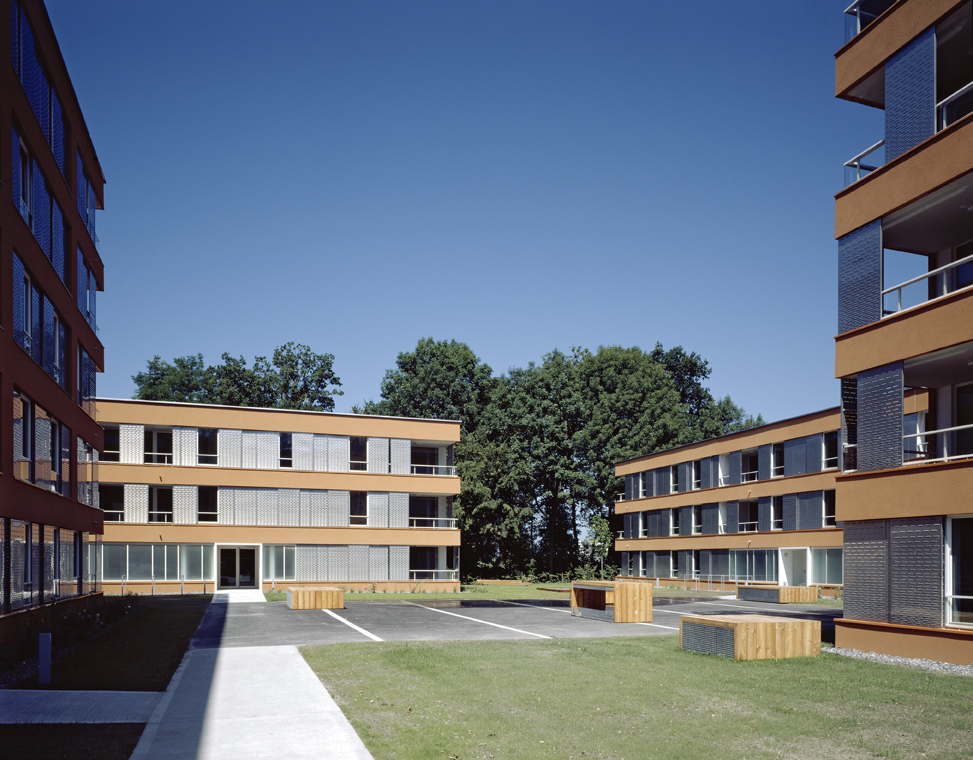 Um einen zentralen Platz werden vier Baukörper angeordnet, der bestehende Baumbestand weitgehend erhalten. Das neue Quartier reagiert auf die Arlbergstraße mit zurückversetzten fünfgeschossigen Gebäuden, also mit verdichtetem Wohnen, in die Parklandschaft werden zwei dreigeschossige Bauten gesetzt.