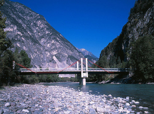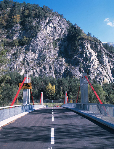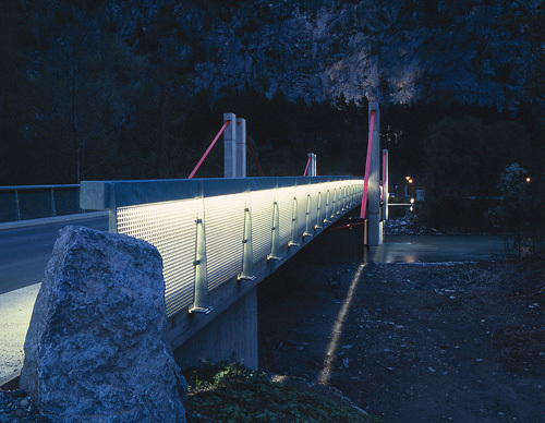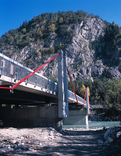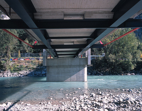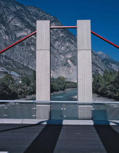 Das Brückentragwerk ist eine Verbundkonstruktion (Gesamtlänge: 87 m; Breite 8,5 m) mit einer Abspannung aus einem durchlaufenden Stahlzugband. Die Lagerung dieses Flachstahlprofils erfolgt auf Doppelpylone, die wie eine große Stimmgabel zeichenhaft mitten im Fluss stehen. (Text: Architekt)