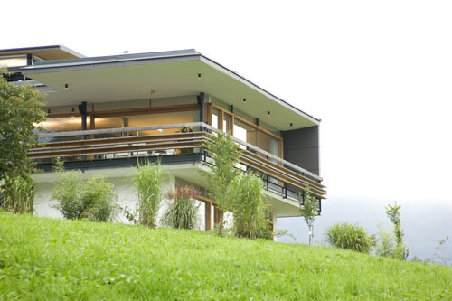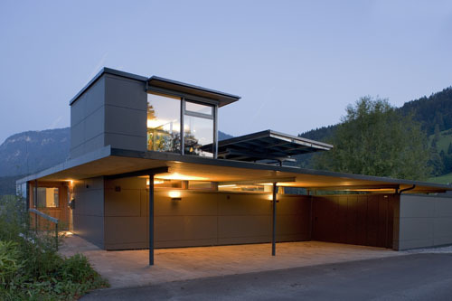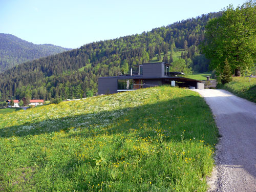 Als Energiequelle für Heißwasser und Heizung wird ausschließlich Sonnenenergie genutzt. Im Bereich der Fundamente wurden in etwa 4.000 lfm Solerohre verlegt, welche die Einlagerung und Speicherung der Sonnenergie möglich machen. Die Solarpanele wurden als zwei hydraulische Hebebühnen mit jeweils ca. 8 x 3,7 m Fläche realisiert, die entweder flach auf dem Dach liegen oder aber auch stufenlos bis zu einer sehr starken Neigung angehoben werden können. (Text: Architekt)