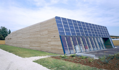 Auf einer gut gedämmten Fundamentplatte aus Stahlbeton wurde ein Holzständerwerk errichtet. Die vorgefertigten Elemente sind innen mit OSB- und aussen mit MDF- Platten beplankt, die für die nötige Aussteifung sorgen und wie bei den Dachelementen die innen sichtbare Oberfläche bilden. Südseitig wurde die Fassade bis zu einer Höhe von 2,50 Meter vollständig verglast und darüber mit Photovoltaikmodulen verkleidet. (Gabriele Kaiser nach einem Text der Architekten)